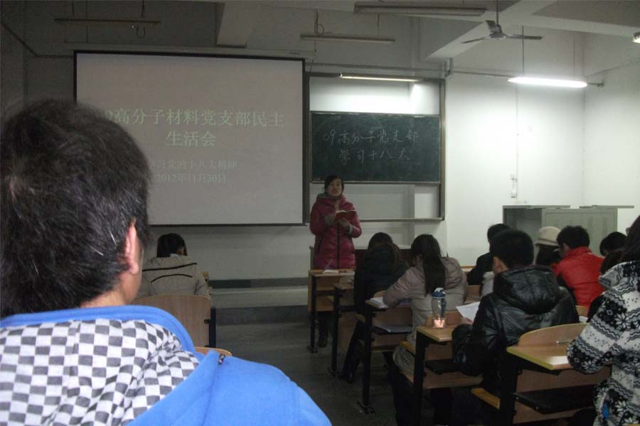 为积极响应院党委的号召,深刻领会和全面贯彻落实党的十八大精神,进一步加强基层党组成员的党性修养,提高大学生党员的政治理论水平,我院高分子09党支部于12月3日下午,在院楼2203室组织学习了党的十八大精神,09级材料专业辅导员、院团委书记朱伶俐老师,院党工委的相关同志及支部全体成员参加了会议。会议由支部书记陈阳主持。 会上,陈阳首先安排大家观看并学习了《中国共产党第十八次全国代表大会》视频新闻。随后,朱伶俐老师分别从“十八大报告内容”及“党章修改”等方面对十八大内容着手,对报告中的新思想、新观点、新论断以及五位一体、八项要求、两个目标、科学发展观等八大关键词进行了解读详细解读,使各位党员、预备党员对“十八大”精神有了深刻领会。最后,陈阳对会议进行了总结,并对以后工作做了几点要求。通过学习,各位党员、预备党员对党新时期的工作情况有了基本的了解,将加快跟随党的脚步,更好地将十八大精神落实到具体行动当中,在学习和生活中起好模范带头作用,争先锋、做榜样,推动学院和谐稳步发展。