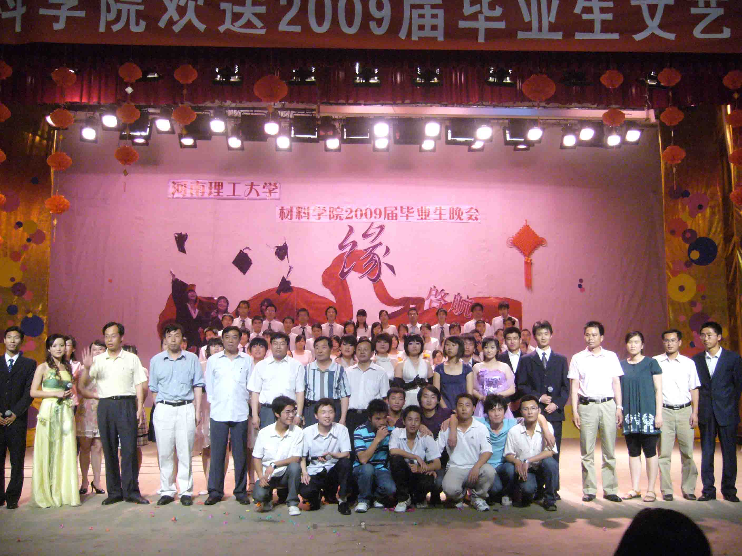 演出前,院党委书记张义顺向全院245名毕业生致欢送词,并送上了殷切的祝福和美好的希望。晚会在舞姿曼妙、节奏舒缓的交谊舞中拉开了帷幕。极具生活气息的小品《巅峰对决》以百年理工校庆志愿者选拔为背景,用校园里最流行的语言,最夸张的表情和动作,博得了全场观众的阵阵掌声,在轻松愉快的气氛中将整场晚会推向了高潮.“只要你过得比我好,过得比我好,什么事都难不倒,一直到老……”,一曲未终,所有毕业生都已经泪流满面,只因师恩难忘,今宵难忘啊。院党委副书记欧阳文峰和黄光许老师倾情演唱的这首歌曲《只要你过得比我好》真正唱出了毕业生临行前所有授业恩师殷切的嘱托、无怨无悔的心声和依依惜别时的感伤。杨雷老师演唱的歌曲《人生无悔》高亢明亮,雄浑壮阔,充分展示了对09届毕业生在面对漫长人生道路时的殷切期望和美好祝愿。我院李旭升老师等人创作表演的三句半《颂理工、赞材料》用一种喜闻乐见的形式回顾了百年理工的沧桑历程和我院的辉煌历史,评析了当前的就业形势并展望了毕业生灿烂美好的前景。八名毕业生代表真情动人的诗朗诵《追忆–起航》撑着思绪的翅膀回顾了激情燃烧的四年,重温了这段无怨无悔的似水年华。虽然无数的第一次,无数的欢乐伤悲都成了回忆,虽然今天在这六月里体会离别的感伤,但无论何时何地,理工大都是远航者最坚强的后盾,我院永远是远游学子最温暖的家。最后,晚会在毕业生共同演唱的两首饱含无限离情别绪的歌曲中圆满结束。