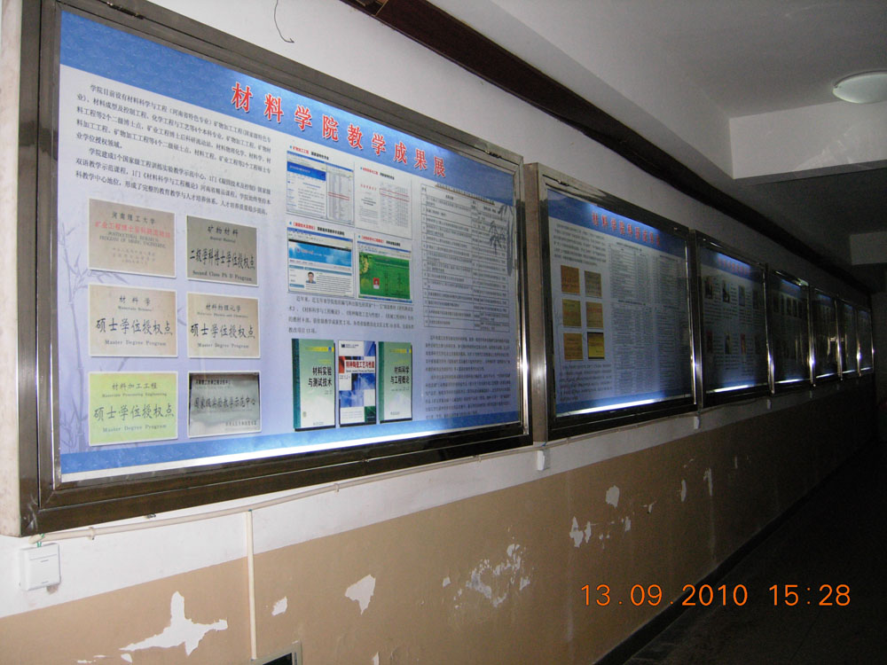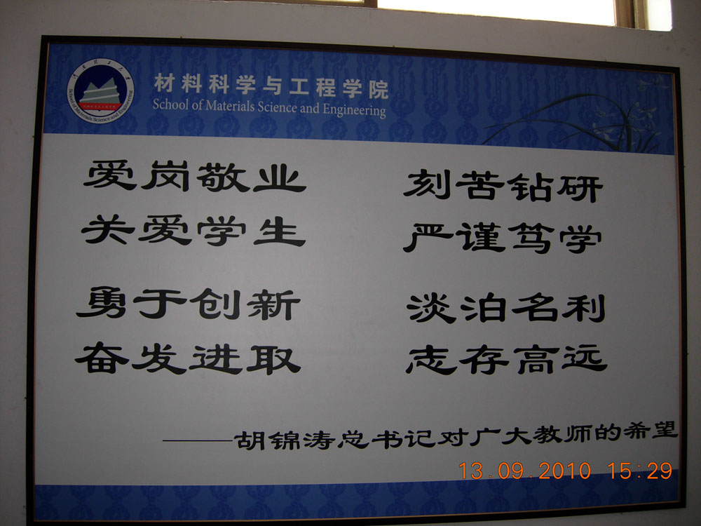 院党委对学院文化建设进行了整体规划,共安装橱窗14个,悬挂名言警句标语40条。以胡锦涛总书记“爱岗敬业、关爱学生,刻苦钻研、严谨笃学,勇于创新、奋发进取,淡泊名利、志存高远”的四点希望为教师从教提出了新的更高要求,传承了“自强不息,奋发向上;崇尚学术,育人为本”的学校办学精神和理念,并提出了“材料人,好材料;团结心、共和谐”的学院精神,营建具有浓郁人文关怀的学院精神文化。