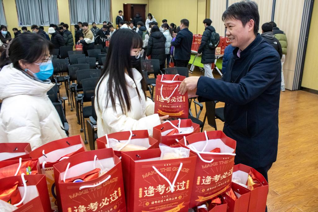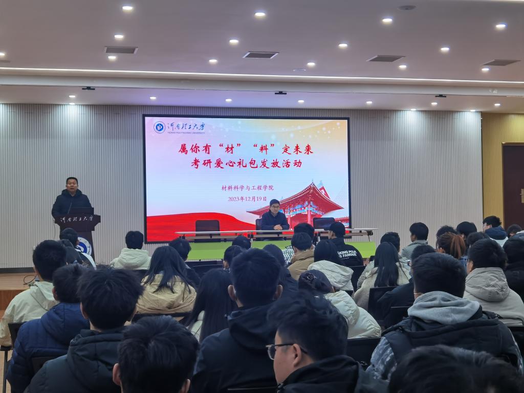 活动伊始,学院党委副书记杜小保作考前动员讲话。他肯定了考研学子一年以来用脚踏实地的拼搏逐梦远方的努力与坚持,又通过分析今年的考研形势和近几年我院的考研成绩,激励同学们保持前进的动力,奋力拼搏。接着,院领导和老师代表为考研学子发放精心准备的助力包。礼包使用红色手提袋包装,寓意“红红火火”,其上印有“乘风破浪、奔赴山海”“逢考必过、成功上岸”的祝福语;礼包中含有“牛”气冲天的牛奶、“暖”心随行的暖身贴、“薯”你最棒的薯片、“糕”枕无忧的糕点、“苹”安上岸的苹果、“棒”上有名的棒棒糖共六种东西,代表着六六大顺,“研”途顺利。助力包承载着来自学院的温暖的祝福,寄托着老师们真切的叮嘱和浓浓的关爱。活动现场,老师们一边发放礼包,一边与考研学生进行亲切交流,叮嘱同学们在考研冲刺的最后阶段要注意防护、保重身体,鼓励同学们稳定心态、全力以赴,今年一“研”为定,明年定为“研”一。在收到学院精心准备的礼包后,同学们备受鼓舞,纷纷表示一定会脚踏实地,给自己的考研之路交上一份满意的答卷,不辜负学院和老师们的期望!
