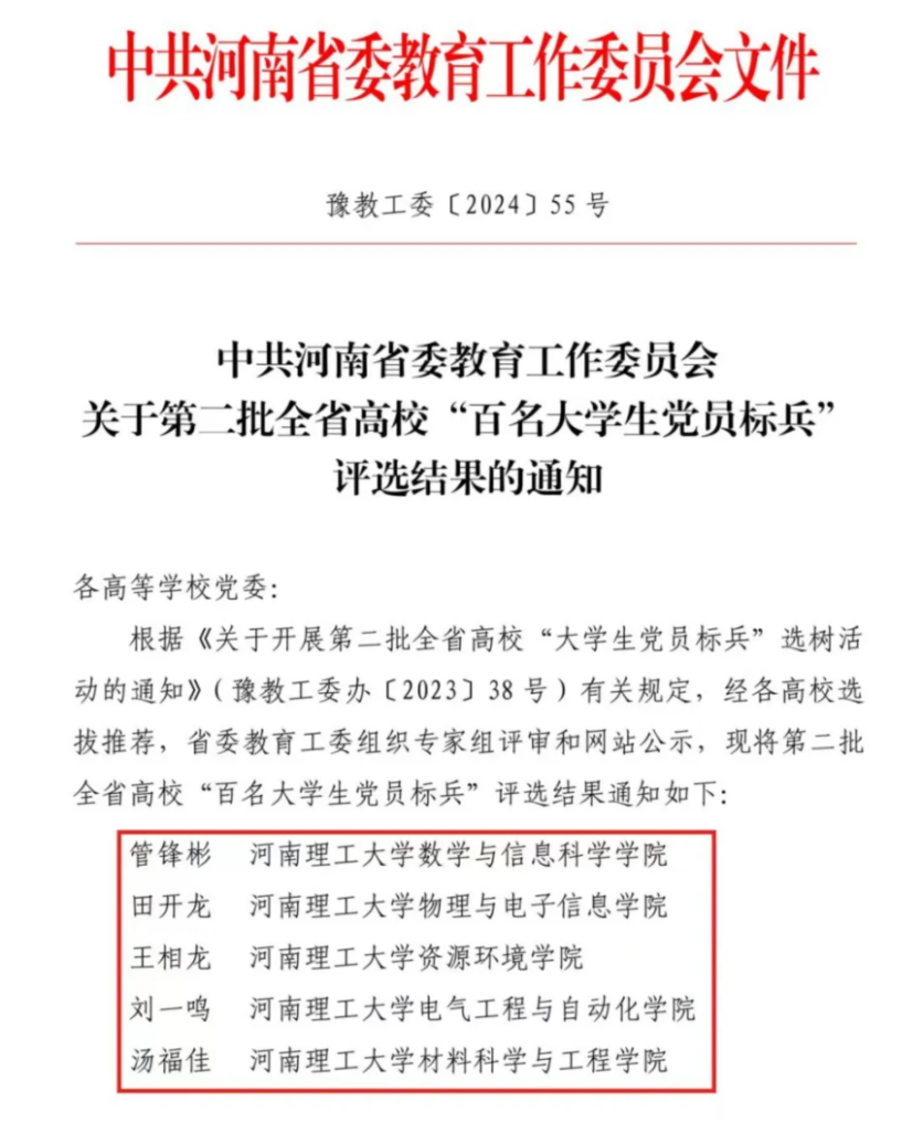 近日,河南省委教育工委公布了第二批全省高校党建工作强基引领“三级联创”等活动评选结果,我院材控专业本科生党支部成员汤福佳同志荣获河南省高校“大学生党员标兵”称号。此项荣誉不仅是对汤福佳同志个人品质与成绩的认可,更是对我支部工作成效实绩的肯定。