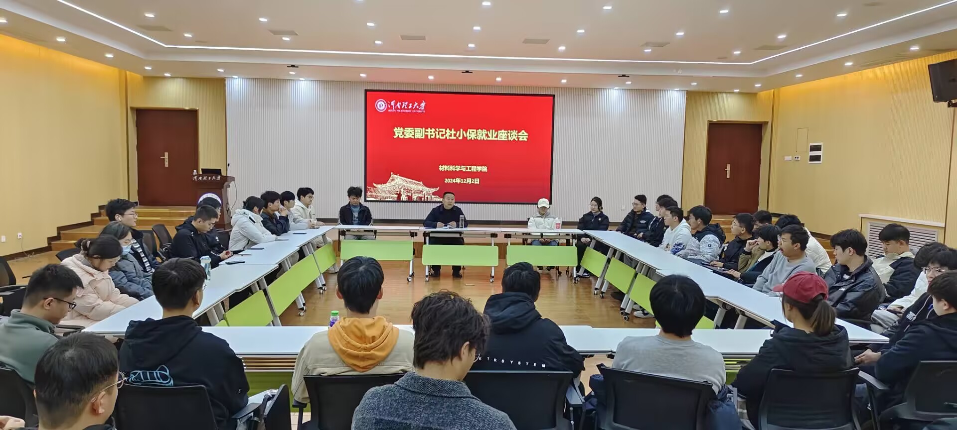 11月29日下午,杜小保与材控2401和2402班的同学在院楼1203进行座谈。与会同学围绕养成良好行为习惯的座谈主题,就早操早读、宿舍楼内洗衣机的合理使用、参加校内科创和文体活动等提出了自己的疑惑或想法,杜小保分别给予了解答和指导。双方还就宿舍环境、考研与就业的选择、校内生活中的一些现象进行了沟通。