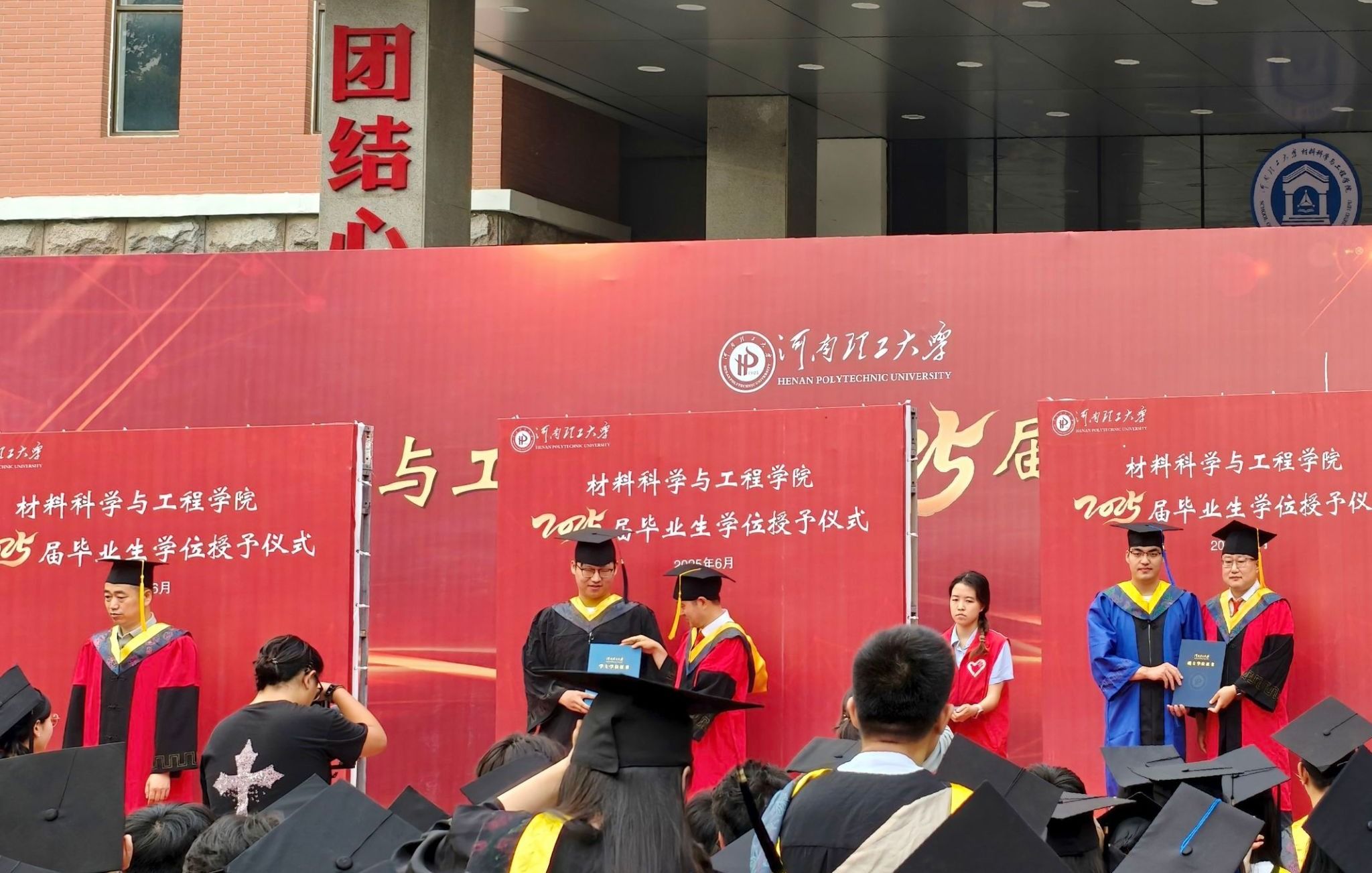 院长朱建平向同学们送上美好的祝愿,并提出三点期望:一是保持创新的锐气;二是要锤炼坚韧的意志;三是要涵养协同的格局。同时,要坚守初心如磐,筑牢材料之魂,各展锋芒似星,共汇民族复兴的星河。随后,学工办主任苗鑫带领全体人员齐声诵读学校和学院的核心价值理念,大家共唱河南理工大学校歌,毕业典礼环节结束。在学位授予仪式环节,全体毕业生依次有序上台受礼,由学位委员会成员分别为毕业生拨穗正冠、颁发毕业证书并合影留念。