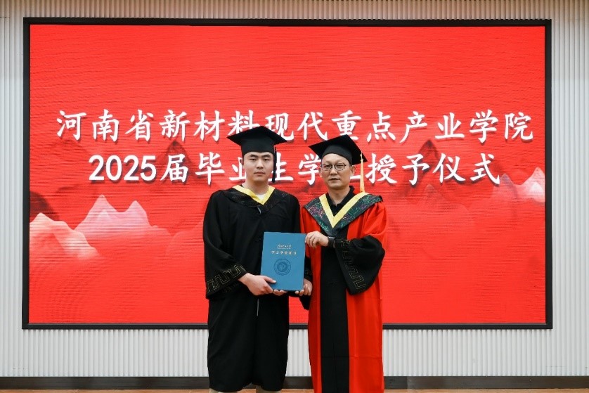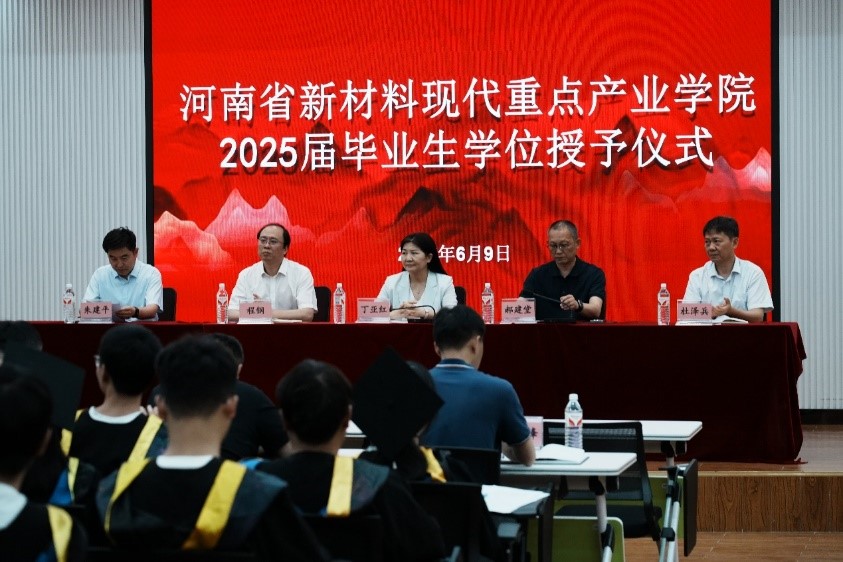 6月9日,我校河南省新材料现代重点产业学院2025届毕业生学位授予仪式在材料学院2103报告厅举行。副校长丁亚红、多氟多股份有限公司副总经理、新材料产业学院理事郝建堂、教务处长程钢、材料学院党委书记杜泽兵、材料学院院长朱建平等出席仪式,仪式由朱建平主持。