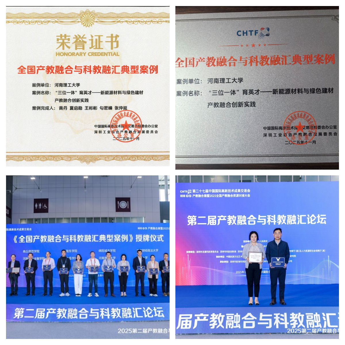 11月14日,在深圳举办的第二十七届中国国际高新技术成果交易会第二届产教融合与科教融汇论坛上,我院新材料产业学院申报的《“三位一体”育英才——新能源材料与绿色建材产教融合创新实践》案例,从全国众多申报项目中脱颖而出,成功入选“全国产教融合与科教融汇典型案例”,并在论坛现场接受授牌。我院副院长、新材料产业学院院长黄丹与学校教务处副处长南华作为代表参会并领奖。 本届高交会以“科技赋能产业,融合共创未来”为主题,设立产教融合与科教融汇专馆及专题论坛,旨在推动教育链、人才链与产业链、创新链深度融合。我院围绕国家战略性新兴产业发展需求,与多氟多新材料股份有限公司、龙佰集团、河南建筑材料研究设计院有限责任公司等龙头企业深度合作,共建新材料产业学院和绿色建筑材料产业学院,创新构建了“校企双主体、育研创三融合”人才培养模式,系统推进“金专、金课、金师、金地、金教材”建设,实现了人才培养与产业需求的有效对接。 |