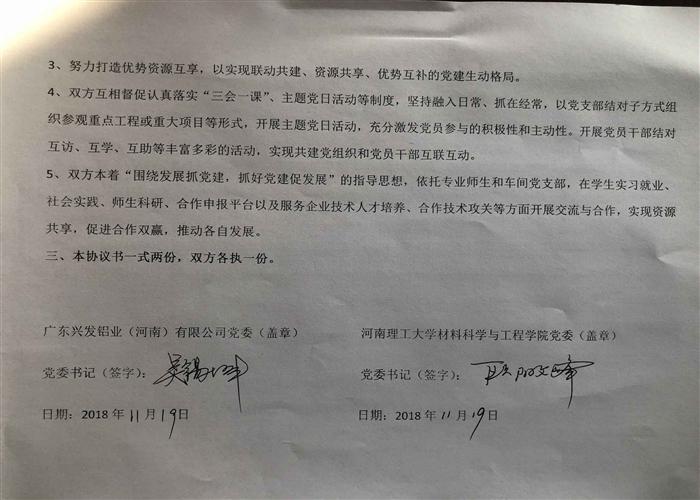 最后,吴锡坤、欧阳文峰代表双方党委共同签署了《广东兴发铝业(河南)有限公司党委与河南理工大学材料科学与工程学院党委党建共建协议书》。协议共建事项包括共同党课、支部结对子、学生实习就业和社会实践、师生科研以及服务企业技术人才培养、合作技术攻关等内容。后续双方相关部门将相互对接,争取早日实现共建成效。