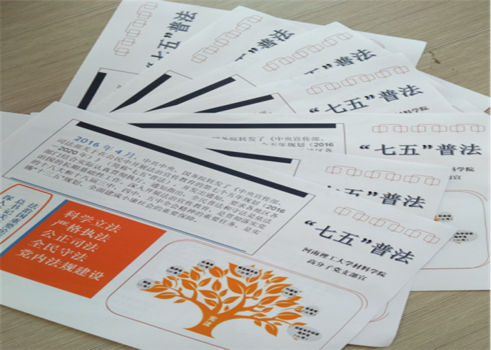 此次普法宣传紧紧围绕“七五”普法规划,着重强调五个方面,深入学习宣传习近平总书记关于全面依法治国的重要论述、突出学习宣传宪法、宣传依法治国和以德治国相结合理念、预防青少年犯罪和预防酒驾。针对此次普法宣传,支部制作了普法宣传单,希望能够以新颖的版式更好地传达上述内容。