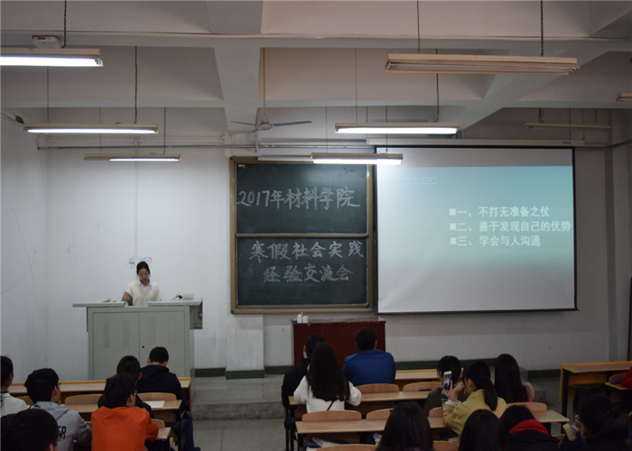 3月14日下午,材料学院2017年寒假社会实践经验交流会在院楼2202室召开。会议展示了我院2017年寒假实践活动成果,回顾总结了寒假社会实践期间的主要工作,并对后期相关工作进行了部署安排。院学生会实践部相关工作人员及16级各班学生代表参加交流会。