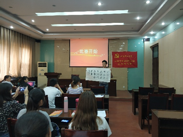 下午五点,天气虽然炎热,无机非学生党支部全体同志准时到达会议室。首先进行“廉洁书法展”活动,由支部成员按照顺序依次介绍自己的书法作品,介绍创作灵感及其含义等。由支委担任评委,最终张天航、马婷婷、王腾飞等几位同志分别获得一、二、三等奖。接下来进行的“知识竞答比赛”活动中,支部成员以小组为单位进行角逐,每位参与人员争相抢答,展现了丰富的党史知识。最后进行颁奖环节,并合影留念。