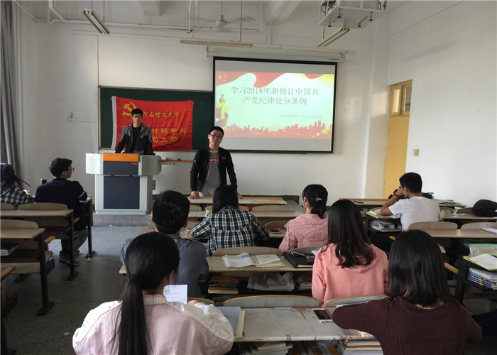 为切实加强党风党纪教育学习,10月9日,高分子学生党支部在材料院楼1405集中学习了《中国共产党章程》和《中国共产党纪律处分条例》,并组织开展了党风党纪主题朗诵比赛。