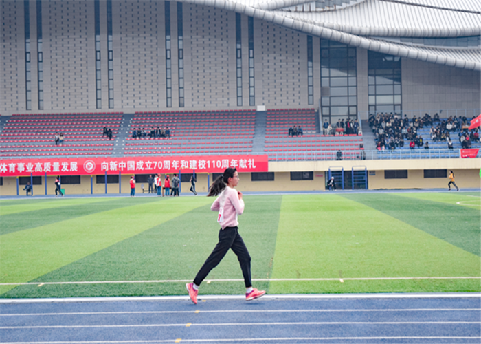 赛前教练统一带着运动员做热身准备,随着裁判的哨声,运动员们弯下腰,脚蹬地,抬起头,准备发令,枪声一响运动员们瞬间起跑。看台上的啦啦队也鼓声雷鸣,为运动员加油助威。我院运动员苏俊霞一直领先,她保持平稳又快速的步伐冲到了最后。运动员鲍慧珍在最后一圈的时候开始加速,逐一反超,最终成为第三名越过终点线的运动员。