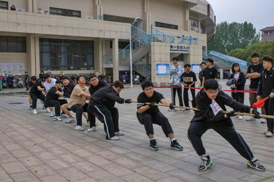 参赛选手紧紧地握住手中的粗麻绳,随着裁判哨响,双方选手立刻用力拉扯着绳子,咬紧牙关,神情紧张而专注。比赛途中双方选手都使出了浑身解数,同学们喊着口号为团队助威。在激烈的较量中,他们毫不退缩,每个人都在为了团队的胜利而拼搏。经过一轮接一轮的激烈比拼,材料学院最终收获了男子组拔河比赛第五名。