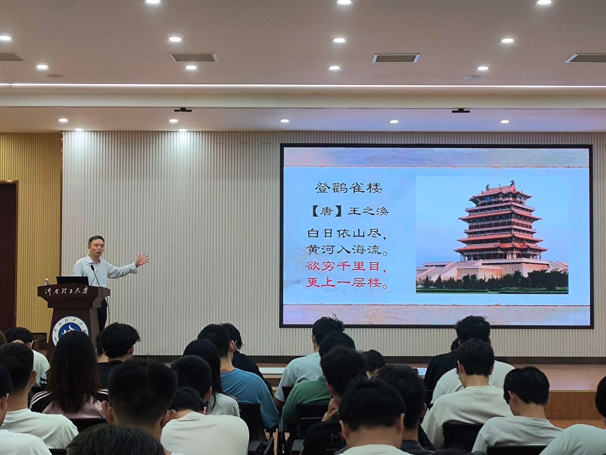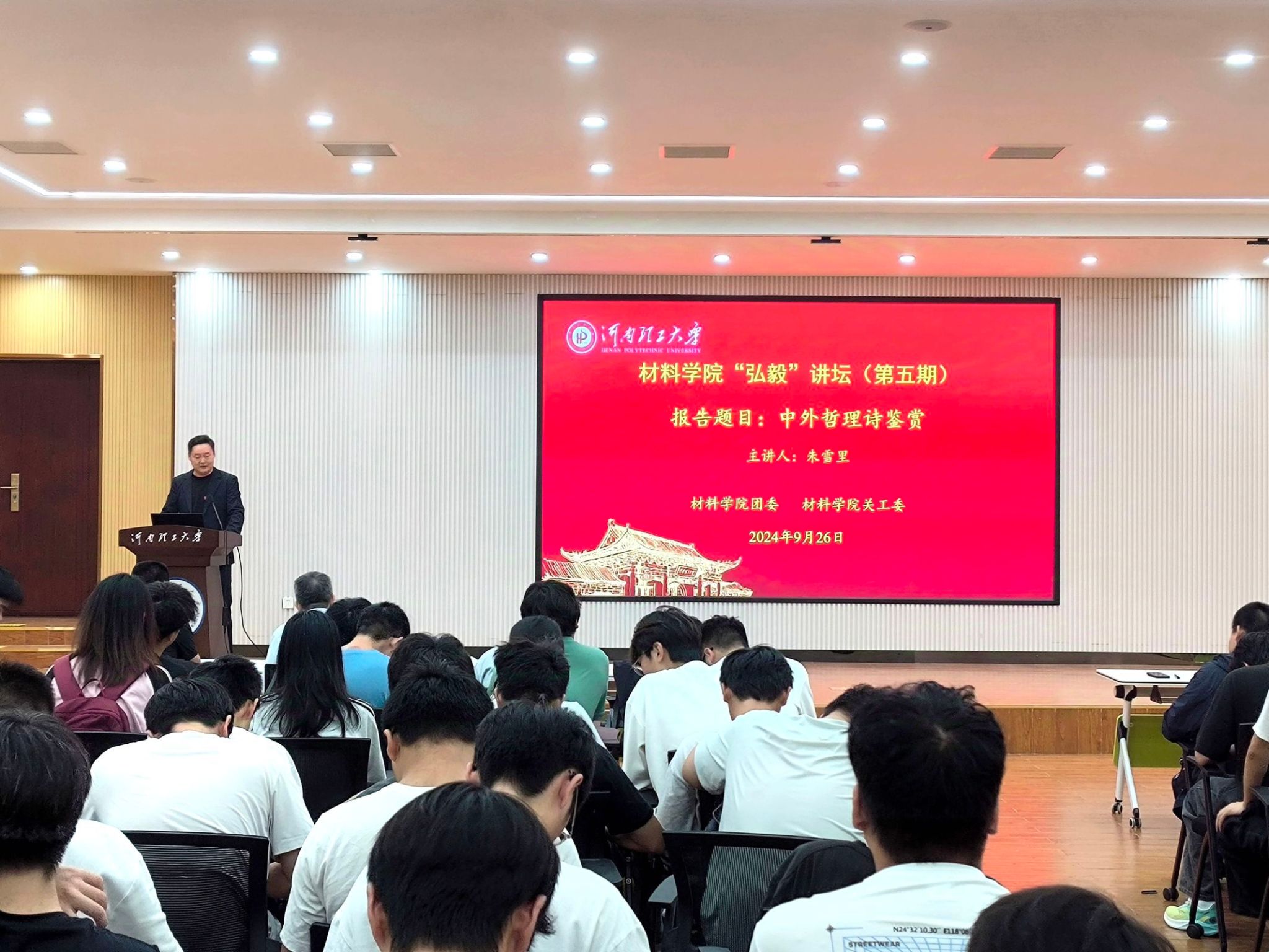 9月26日上午,我院在院楼2103多功能报告厅举办第五期“弘毅讲坛”,特邀我校文法学院组织员、关工委常务副主任、河南诗词学会常务理事、焦作市作家协会副主席朱雪里作专题报告。讲座由学院党委副书记杜小保主持,120名23级学生代表参加。 朱雪里报告的题目是《中外哲理诗鉴赏》,他从中国各个时期以及外国诗词中精心挑选了多首具有代表性的诗歌进行详细介绍,包括《登鹳雀楼》、《游子吟》、《梦》等。朱雪里不仅通过生动的讲解和深入的剖析,阐述了每首诗的不同主题和道理,还通过举现实例子,让听众们直观地理解诗词,感受诗歌的魅力和力量。他也在讲解途中提醒同学们要努力学习、积蓄力量、明确目标,并学会抵制诱惑、坚定信念。 在报告中,朱雪里还注重与听众的互动和交流。他设置了提问环节,鼓励同学们积极回答问题,提出自己的见解。同时,他还准备了自己的著作作为礼物,送给那些积极参与互动的同学。这一环节增强了讲座的趣味性,让学子们在轻松愉快的氛围中收获知识和人生的启迪。 本次报告内容丰富,思想深刻,不仅为听众提供了一个深入了解诗歌的机会,还使他们受到深刻的人生哲理教育,让大家受益匪浅。 |