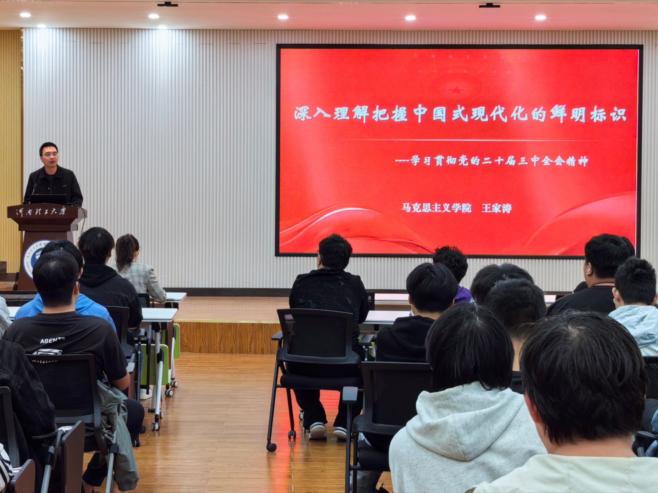 为深入学习贯彻党的二十届三中全会精神,引导广大师生深刻领会中国式现代化的核心要义与实践要求,9月23日下午,我院于院楼2103多功能厅举办第十三期“弘毅讲坛”。本次讲坛特邀我校马克思主义学院王家涛副教授作专题报告。学院部分师生代表参加学习。会议由专职辅导员张莹主持。 会上,王家涛以“学习党的二十届三中全会精神,深入理解把握中国式现代化的鲜明标识”为题,作了一场内涵深刻的辅导报告。报告系统梳理了新时代我国对外开放的战略演进与辉煌成就,深刻阐释了开放作为国家发展关键一招的理论逻辑与实践伟力。他结合详实数据,深入分析了当前国际大循环面临的严峻挑战与各国应对策略,并重点就发展新质生产力、推进高水平教育开放、中国制造逐渐走向世界、出口新三样等内容进行了深入阐释。最后,报告深刻剖析了逆全球化思潮下复杂的国际形势,并在此基础上,系统阐述了我国在新征程上推动高水平对外开放的战略路径与关键举措。 此次讲坛紧扣时代脉搏,既有理论高度又有实践深度,对于提升师生思想政治素养、把握时代发展趋势具有重要意义。 |