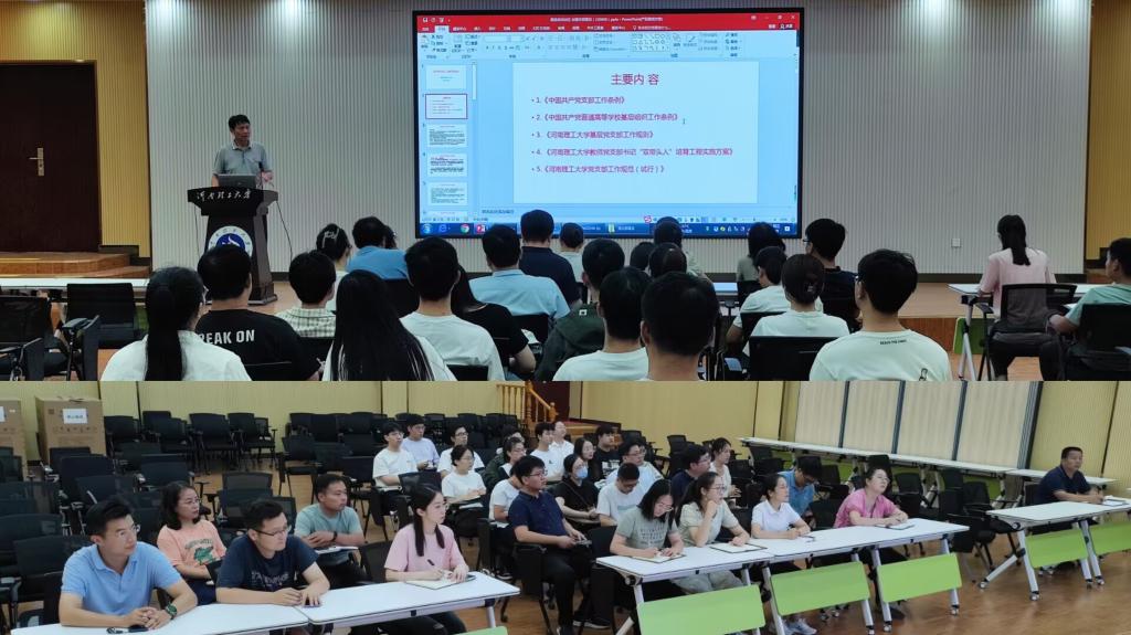 在此次会议中,我院党委书记杜泽兵主要围绕《中国共产党支部工作条例》《中国共产党普通高等学校基层组织工作条例》《河南理工大学党支部工作规范》进行培训。杜泽兵指出:一要弘扬“支部建在连上”的光荣传统,全面从严治党,充分发挥党支部战斗堡垒作用,加强对入党积极分子的教育与培养,做好发展党员的工作;二教职工党支部要落实立德树人的根本任务,学生党支部应加强思想政治引领,引导学生刻苦学习,全面发展,健康成长;三要注意党员队伍的建设和思想政治工作,推进“两学一做”学习教育常态化,提高“三会一课”质量,坚持理论联系实际,办好思想政治理论课,推进课程思想建设。
