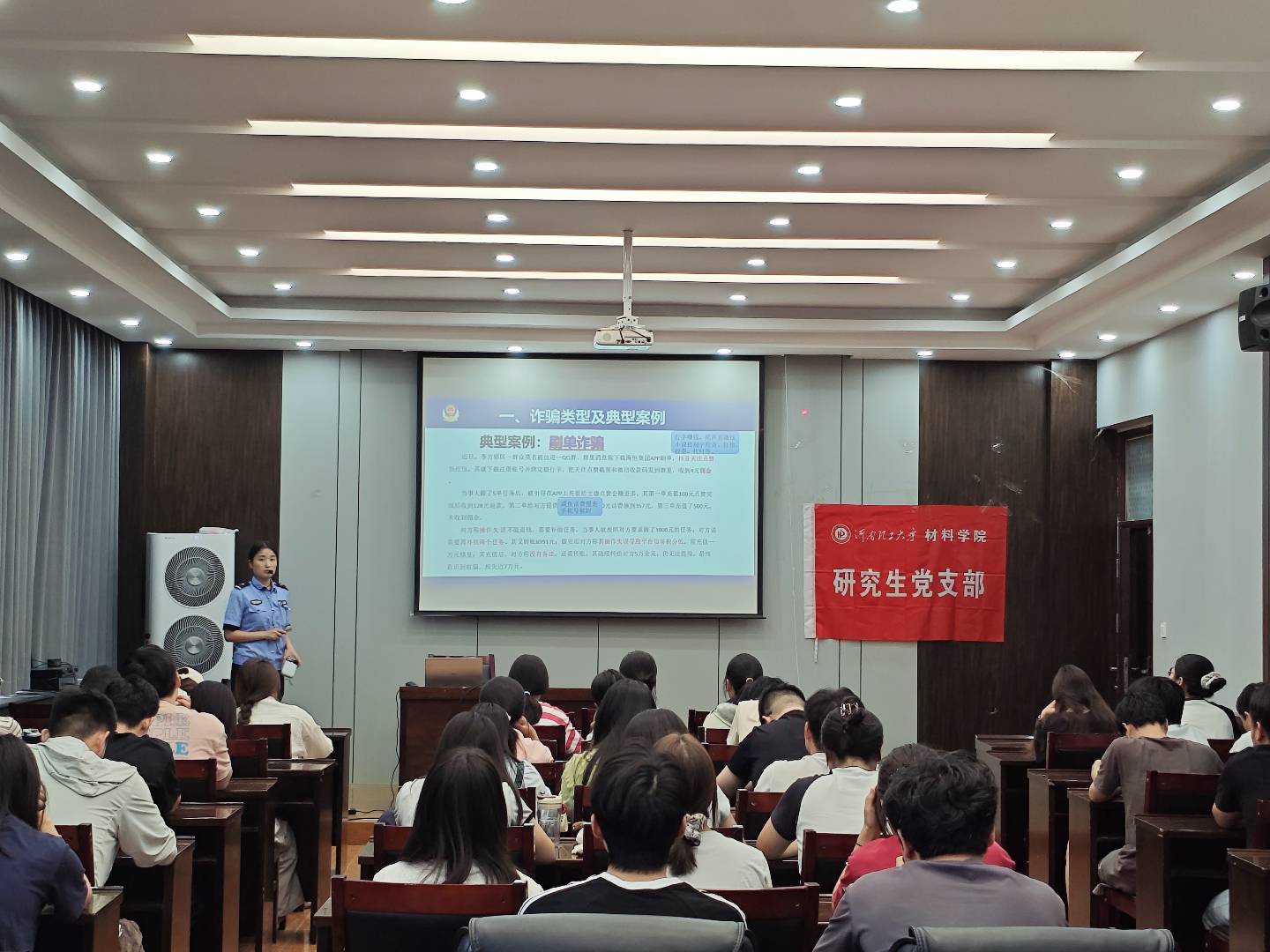 为切实提升研究生群体的反诈防骗能力,筑牢校园反诈安全防线,6月27日下午,我校研究生党支部特邀辖区派出所民警走进校园,开展反诈宣讲活动。 民警结合近年来发生在高校的电信网络诈骗典型案例,以通俗易懂的语言,详细讲解了网络贷款诈骗、刷单返利诈骗、冒充老师或同学诈骗、游戏账号虚假交易诈骗等常见诈骗类型的作案手法和特点。民警还针对研究生群体的特点,重点讲解了学术成果相关的诈骗陷阱。在互动问答环节,学生们踊跃提问,就自己遇到的疑似诈骗情况向民警请教。现场互动氛围热烈,学生们的疑问得到了及时解答。 |