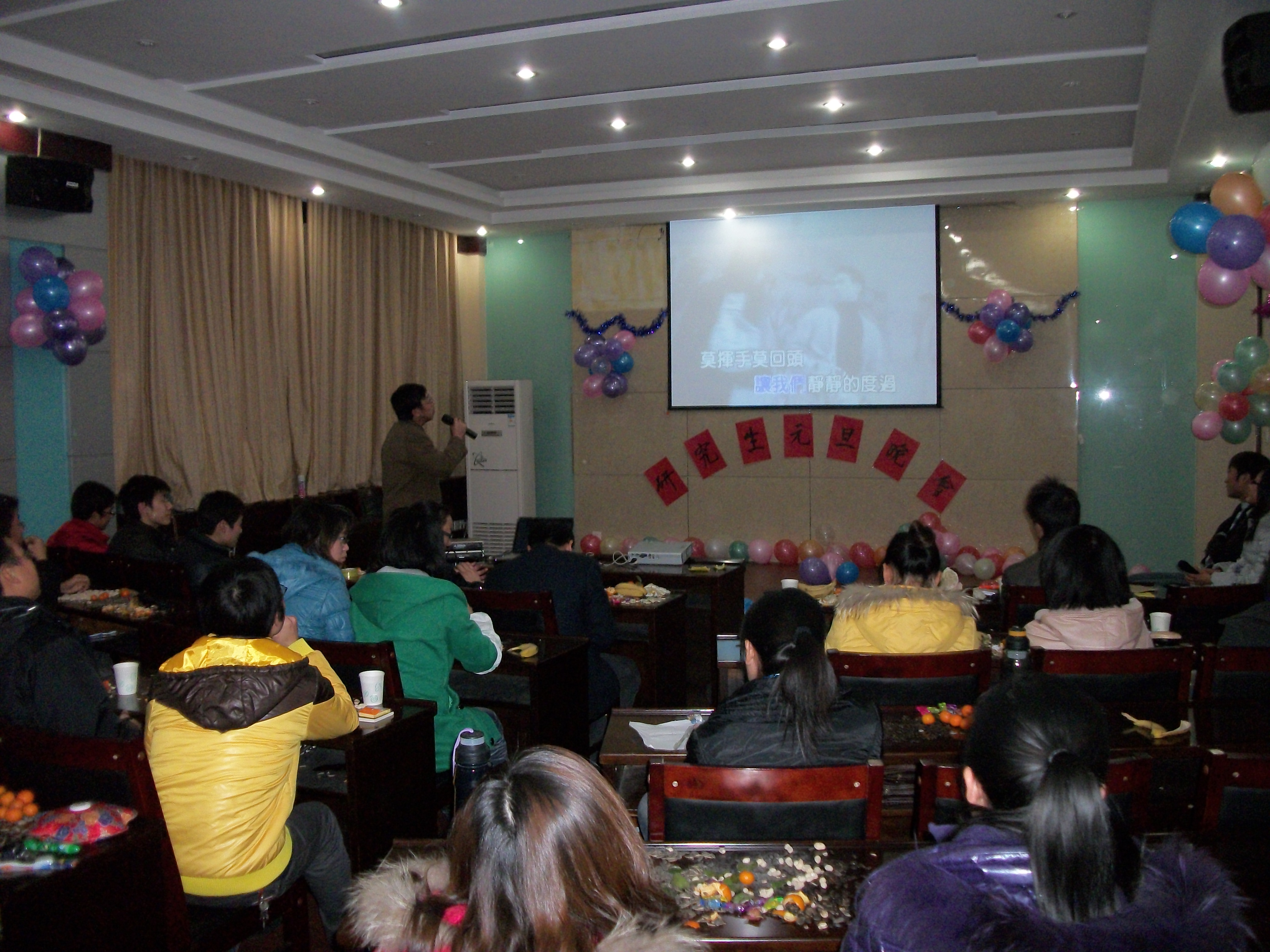 张灯结彩辞旧岁,欢声笑语迎春来,12晚月31日19:00,我院研究生在材料学院1203成功举办元旦联欢晚会。欧阳文峰书记、张志院长、吴文荣老师、李强老师以及08、09级研究生共同参加并观看了晚会。