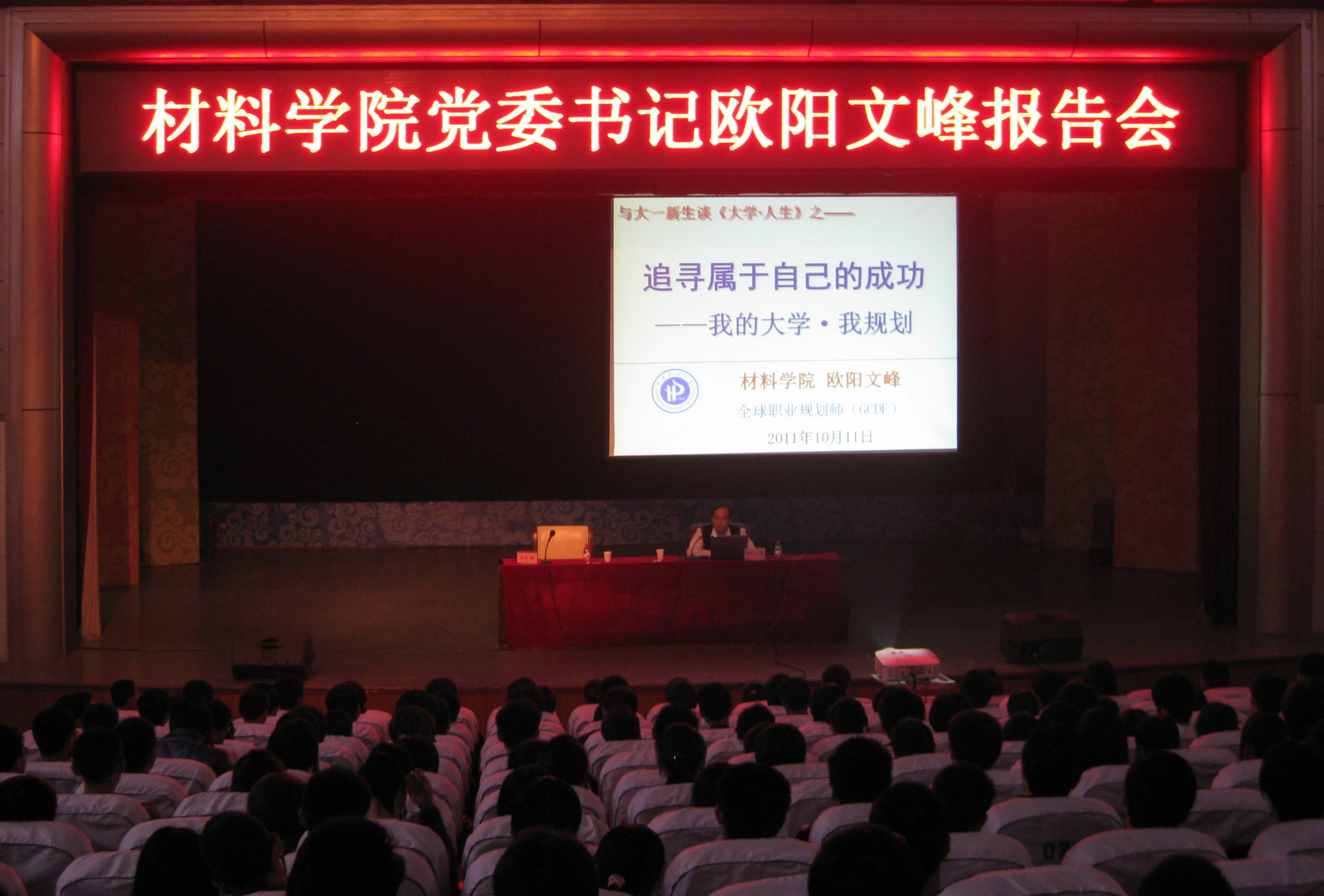 为了更好地引导大一新生走过大学生涯,帮助他们明确目标定位,10月11日下午,在我校南校区小礼堂,院党委书记、全球职业规划师欧阳文峰作了一场题为“追寻属于自己的成功—我的大学·我规划”的报告会。院党委副书记谢玉芬出席报告会,报告会由院团委书记朱伶俐主持。