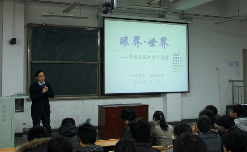 12月13日下午,材料学院党委书记欧阳文峰在材料楼2103作了一场题为“眼界•世界——参访美国加拿大有感”的报告。报告会由院团委书记朱伶俐主持,300多名师生聆听了本次报告。