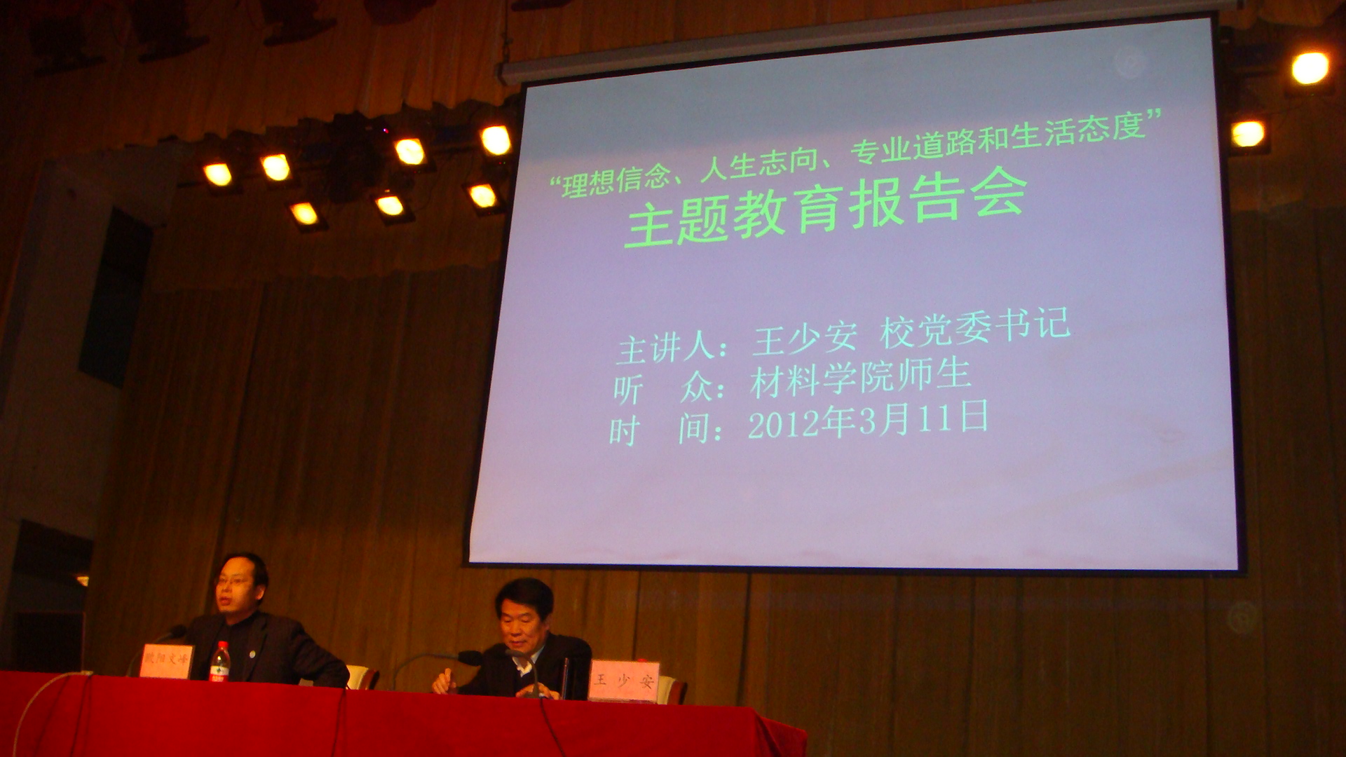 3月11日晚,校党委书记王少安在小礼堂为材料学院师生做了主题为“理想信念、人生志向、专业道路和生活态度”的主题报告会。报告会由材料学院党委书记欧阳文峰主持,材料学院辅导员、班主任和2010、2011级800余名学生参加了此次报告会。