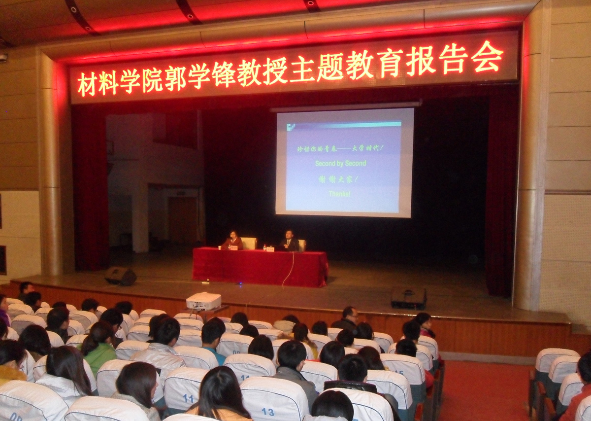 3月20日晚,我院第三场“理想信念、人生志向、专业道路和生活态度”主题教育报告会在小礼堂进行。副院长郭学锋教授为大一、大二及大三部分学生作了一场关于“材料专业与人生志向”的精彩报告,报告会由院党委副书记谢玉芬主持。
