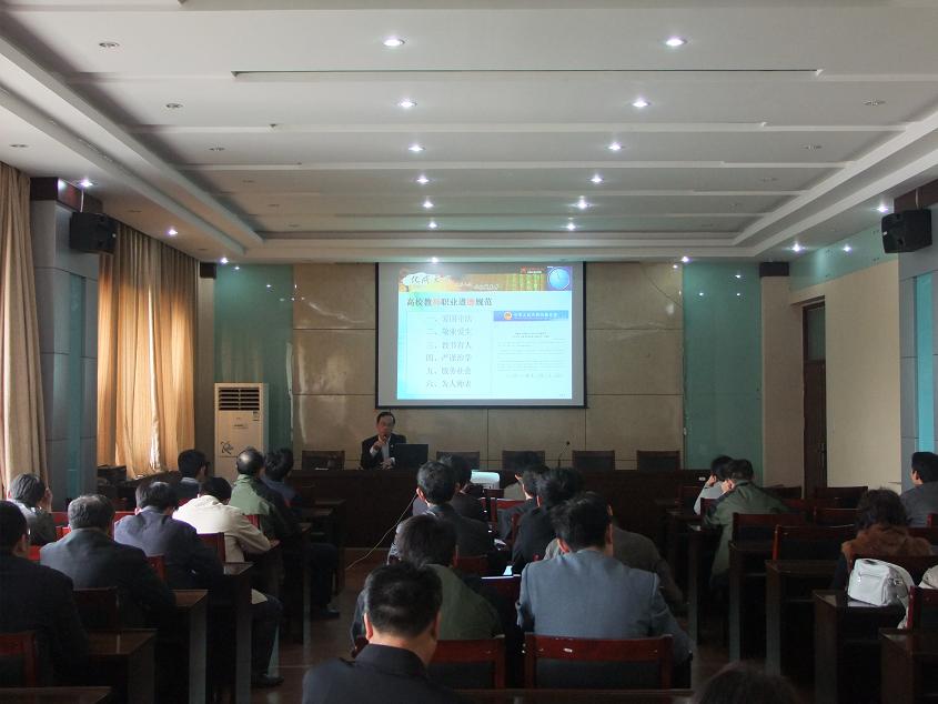 会上,欧阳文峰书记围绕教师职业道德规范,重点阐释了爱国守法、敬业爱生、教书育人、严谨治学、服务社会和为人师表等六个方面的具体内涵和意义,欧阳书记指出作为教师要热爱祖国,热爱人民,忠于人民教育事业,树立崇高的职业理想,以人才培养、科学研究、社会服务和文化传承创新为己任。要坚持育人为本,立德树人,勇于担当社会责任,为国家富强、民族振兴和人类进步服务;对待学生,要树立优良学风教风,以高尚师德、人格魅力和学识风范教育感染学生,促进学生全面发展。对待教学,要严谨治学,弘扬科学精神,努力探索创新,坚决反对滥用学术资源和学术不端行为。