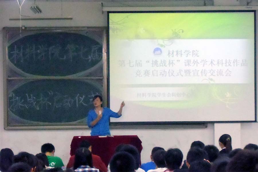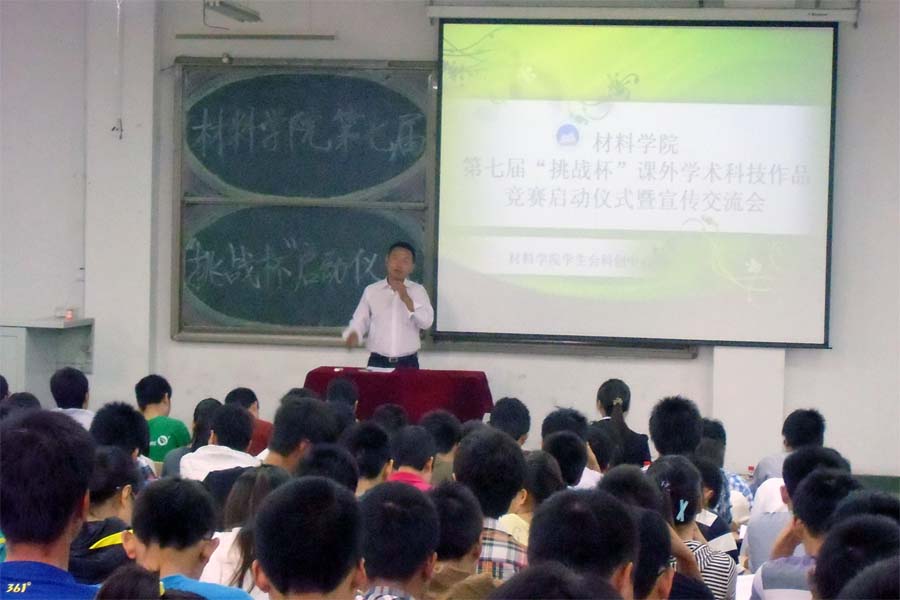 9月23日上午,材料学院在院楼2103成功举办第七届“挑战杯”课外学术科技作品竞赛启动仪式暨宣传交流会。校团委组织部部长李旭升、院团委书记朱伶俐及部分师生代表参加了此次会议。会议伊始,李旭升老师介绍了我校近几年在全国大学生“挑战杯”课外学术科技作品竞赛取得的成绩和参加此项活动的重要意义,并认真分析了参加此项竞赛所存在的挑战。紧接着,朱伶俐老师就该院的“挑战杯”课外学术科技作品竞赛的准备工作作了整体部署并宣布材料学院第七届“挑战杯”大学生课外学术科技作品竞赛启动仪式开始。随后,校宣讲团代表人员及该院优秀学生代表和到场的300余名学生就参与此项竞赛的心得进行了交流。材料学院多年来高度重视大学生科技创新活动。据悉,为加强大学生科技创新工作,该院特成立了大学生科技创新基金,以鼓励和支持更多的学生参与科技创新活动,提高学生的科学素养和科技创新能力。