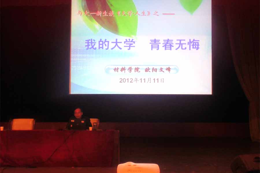 为加强对新生引导,使其尽快适应大学生活。11月11日晚,我院党委书记欧阳文峰在小礼堂召开材料学院2012级新生入学教育系列之“我的大学·青春无悔”专题报告会。院党委副书记谢玉芬、12级辅导员李红光、任晓利及12级新生400余人一同聆听了这场报告会。报告会伊始,欧阳文峰就一封大二同学的来信引入话题,并结合自己的回信来谈及自己对大学和人生的感悟。紧接着,他就“大学是什么地方”、“我们是谁”、“为什么上大学”、“上大学,学什么”、“怎么学”等问题进行耐心细致的阐述。他指出,大一新生应科学规划大学生活,学会自我定位,自我管理,树立远大的人生理想并为之不懈奋斗;注重综合素质的培养,做一个“学、思、知、行”全面发展的当代大学生;着重强调,大学生的主要任务是学习,要协调好学习、工作和生活这三者之间的关系,不能不分主次,顾此失彼。互动环节中,欧阳文峰针对大一新生提出的关于大学生活中遇到的困惑进行了耐心解答与指导。最后,报告会在同学们热烈的掌声中圆满结束。此次报告会的成功举行,不仅有利于我院新生更快地转变角色,科学规划大学生涯,促进全面发展和健康成长,同时也明确了人生方向、坚定了信念,从而有利于我院培养高素质人才战略的实施。