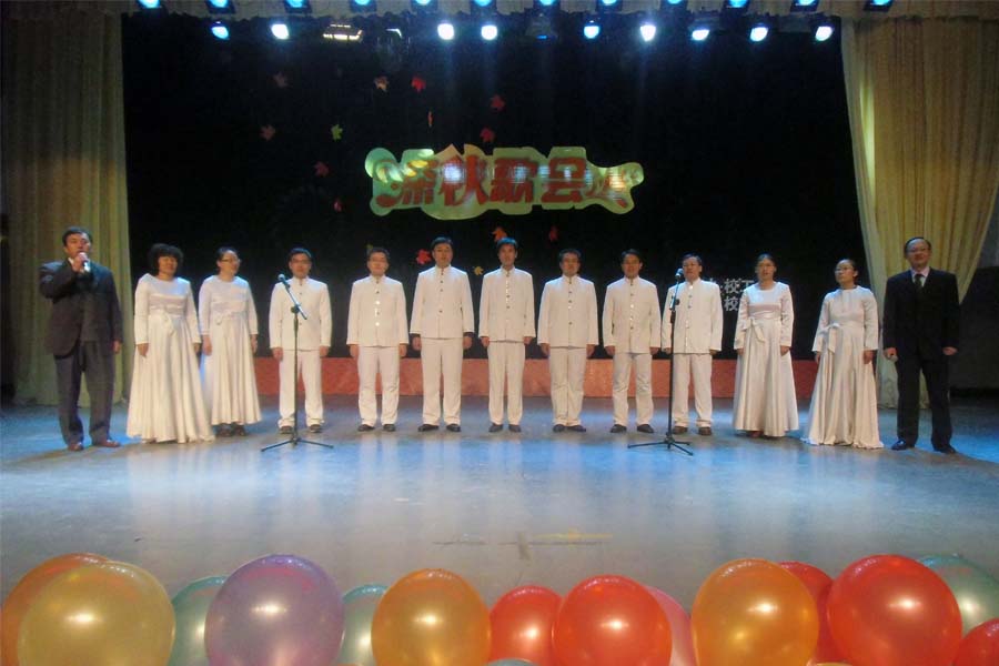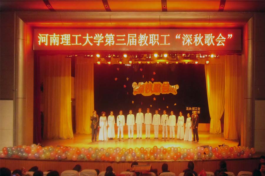 河南理工大学教职工欢聚一堂,深情奏响华美乐章。11月16日晚,由校团委、校工会主办的河南理工大学第三届教职工深秋晚会在小礼堂隆重上演,全校800余名师生共同观看了此次晚会。晚会现场,有气势恢宏的经典红歌,有温馨甜美的家庭小合唱。其中,我院教师集体为观众们演唱奉献了一首经典爱国歌曲《我的中国心》。乐声响起,我院教师迈着整齐的步伐款款走向舞台中央,彰显出材料学院教职工激昂向上的精神面貌;黑白搭配的服装,体现了我院教师严谨的工作态度。歌曲在黄光许领唱下,教师们深情的演绎着炽热的爱国情怀,刚劲有力、豪迈奔放的歌声赢得满堂喝彩。本次深秋晚会精彩纷呈,现场高潮迭起,掌声此起彼伏。此次晚会不仅为我院教师们提供了一个展示自我的平台,同时也体现了材料人的友爱、协作的优秀品质,有利于促进我院师生之间团结、和谐的发展。