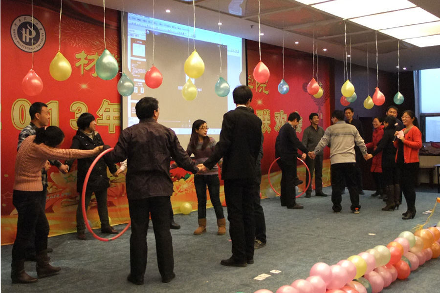 12月31日,由院工会主办、高分子材料系工会小组承办的2013年教职工元旦联欢会暨新年茶话会在迎宾馆宴会厅成功举办,副校长卫中玲、学院领导及全院教职工参加了本次茶话会。联欢会上,教工子女王佳仪演唱的一首《金孔雀》拉开了联欢活动的序幕。联欢会现场安排了“齐心协力”、“众鸡争食喜迎春”、“谁是卧底”、“传呼啦圈”、“天地花开”等精彩的游戏环节,与会教工纷纷积极参与,场上笑声、欢呼声和掌声连天。老师们度过了一个轻松愉快的下午。随后的茶话会由院党委书记欧阳文峰主持。院长管学茂发表新年致辞,他在讲话中回顾了学院2012年各项事业取得的成绩,并对全院师生表示感谢和新年祝福。最后,副校长卫中玲发表讲话,她代表学校对学院的发展提出了新的希望,并向全院教职工致以节日的问候和美好的祝愿。宴会期间,到场学校领导与我院教工等纷纷举杯互贺新年,表达祝福。