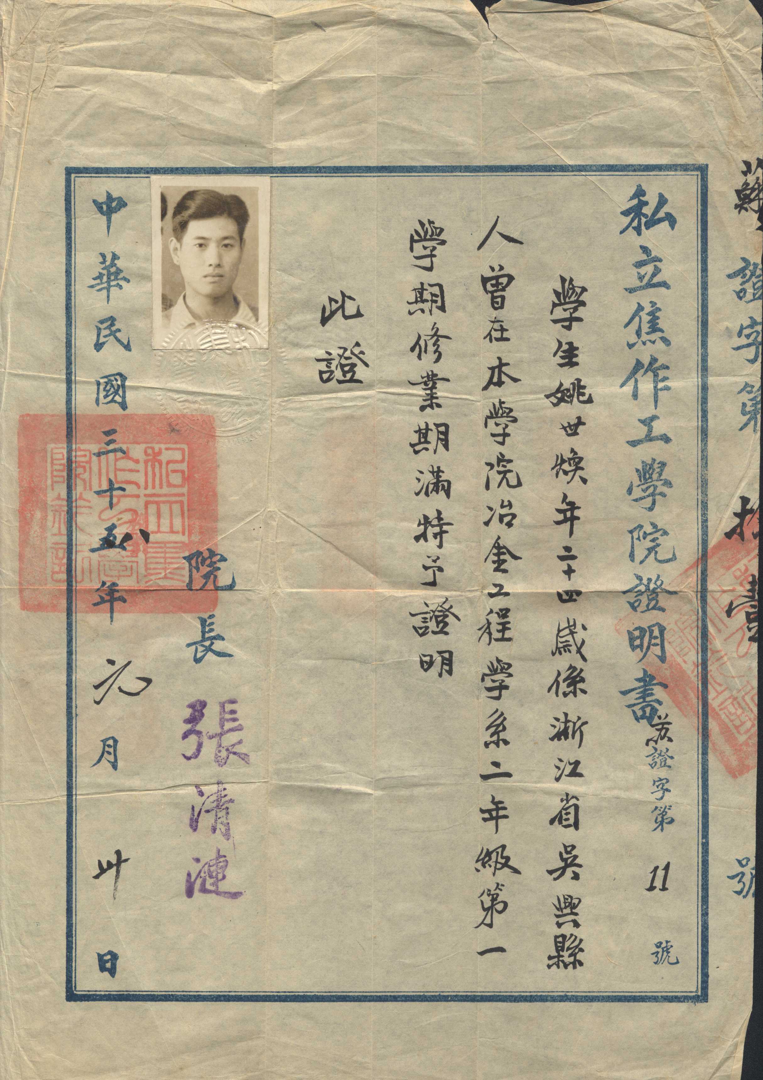 1947年暑假,我进入焦作工学院的冶金系,在校学习两年半。1950年初因院系调整,冶金系全部并入东北工学院。我们班只有不到十人去了东北,因为当时东北缺乏有色金属人才,我们凭着院长张清涟教授的冶金学基础,又继续学习了一些有关课程,全部于1952年分配到了抚顺铝厂。冶金系比我高一班的同学约有40人,他们都师从张清涟院长,学习钢铁冶金系,1950年2月到东北工学院,当年夏季毕业全部分配到当时中国最大的鞍山钢铁公司。冶金系比我低一班1948年在苏州入学的约有50余人,因为都是学习钢铁专业的,于1952年也全部分配到鞍山公司。
