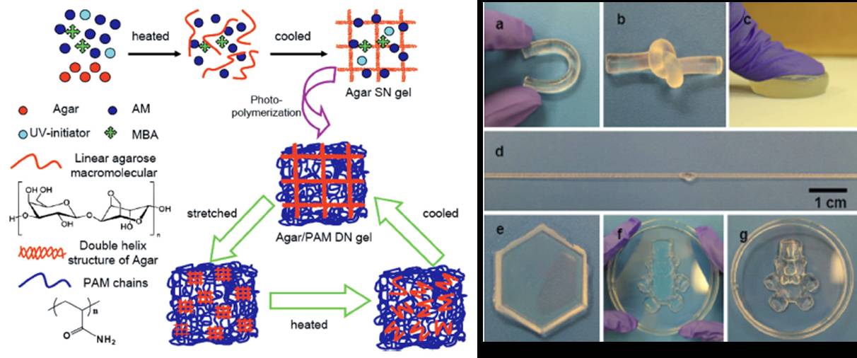 图1. “一锅煮”法制备高强度可恢复双网络水凝胶及其凝胶样品