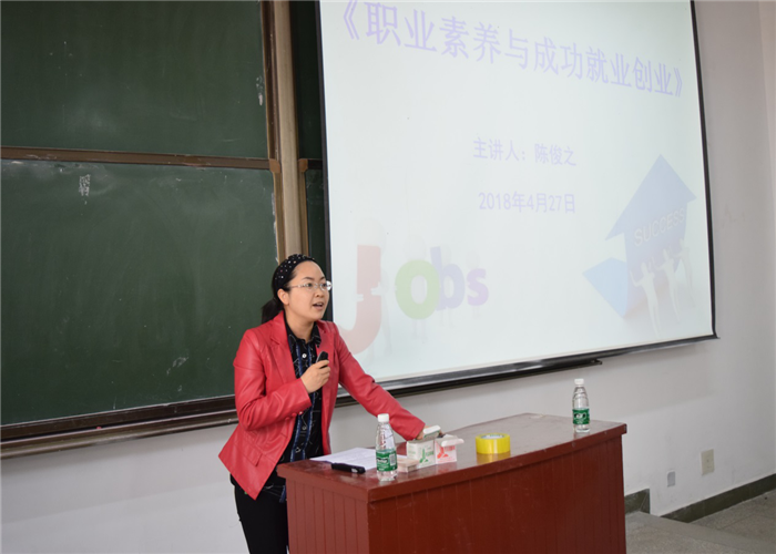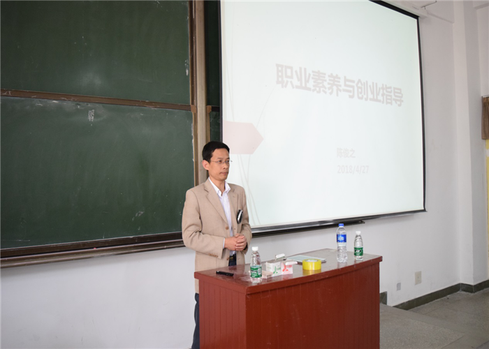 4月27日上午,由校学生部(处)主办、材料学院承办的第53期“树人讲堂”在经管楼1112教室举行。河南理工大学2001届优秀毕业生,无锡迅杰光远科技有限公司生产总监、公司合伙人陈俊之先生受邀作了题为“职业素养与成功就业创业”的专题讲座。讲座由学院谢玉芬副书记主持,材料学院15级学生180余人聆听了此次讲座。