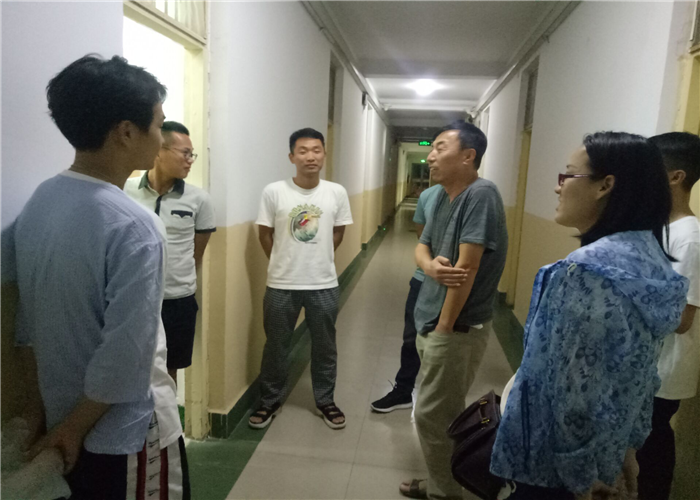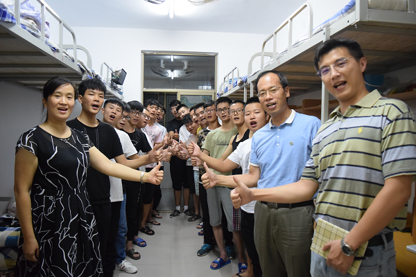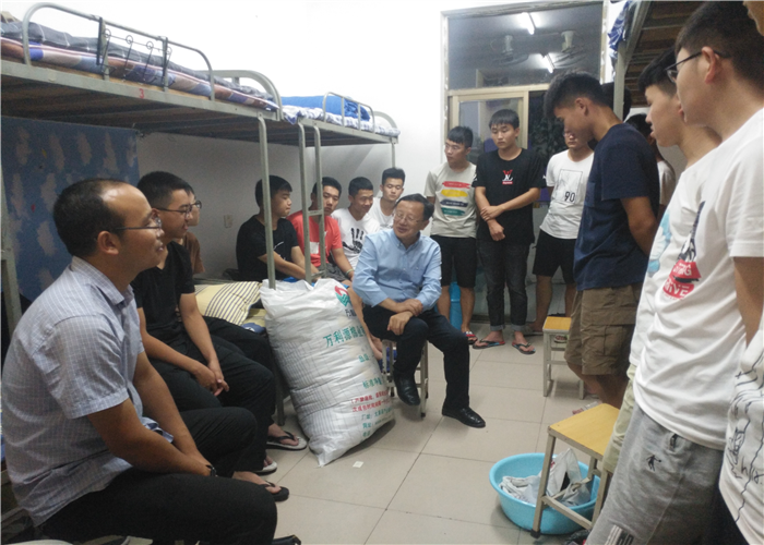党委书记欧阳文峰、院长管学茂等一行走访了本科新生男生宿舍。老师们亲切地向新生了解他们的生源地、家乡风俗习惯等,欧阳书记还向省外的同学们介绍了中原文化以及焦作特产,并表示舍友之间应该互相帮助,加强联系。此外,老师们还劝诫同学一定要好好学习,不要虚度大学时光,管学茂院长更是明确表态:青春理想都是在奋斗中实现的,而不是睡梦和游戏中完成的。