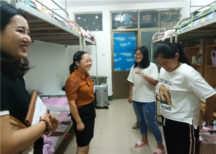 党委副书记谢玉芬携18级辅导员走访了本科新生女生宿舍。老师们同每位同学进行了亲切的交谈,了解同学们初到学校的生活情况以及适应情况;同时也提醒大家在开学之际,要注意人身、财产安全,警惕邪教组织,有问题及时向宿管和辅导员反映;老师们还关心询问了新生到校生活上存在的问题,新生们纷纷与老师们进行了交流,现场气氛十分融洽。最后,谢书记嘱咐新生们好好休整,以更加饱满的状态迎接军训生活。