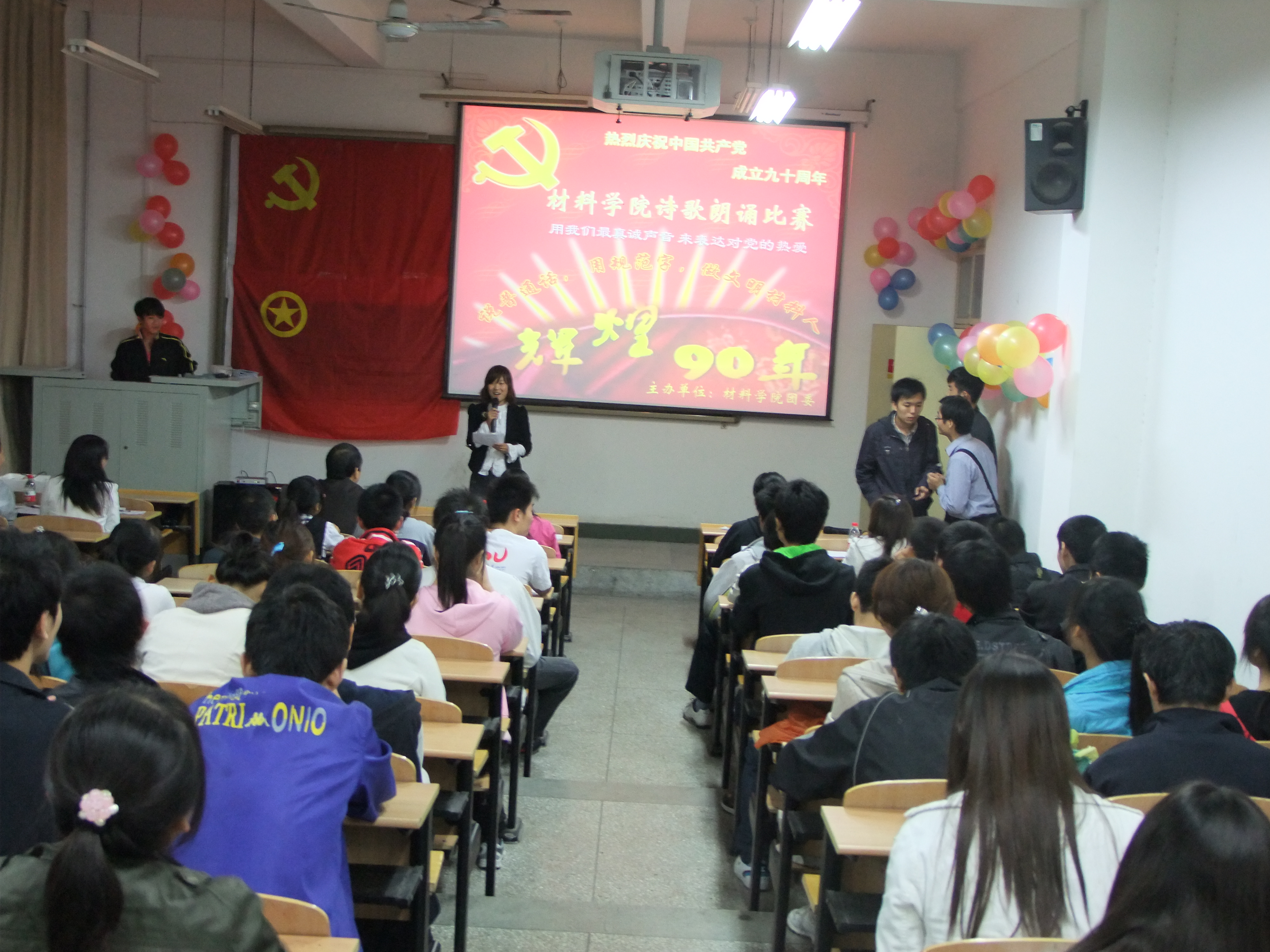 为积极推广普通话、庆祝中国共产党建党90周年,9月17日,我院在院楼1406举办了以“讲普通话,写规范字,做文明材料人”为主题的诗歌朗诵比赛,团委书记朱伶俐、10级班主任李尚升等七名老师担任了本次比赛评委。