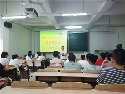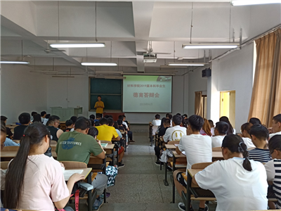 6月25日下午,材料学院于院楼2103、2202、2203教室举行2019届本科生毕业生德育答辩会。2015级部分优秀毕业生参与此次答辩。院团委书记朱伶俐、17级辅导员王昭龙、18级辅导员徐志超担任评委。2017级、2018级全体学生共同观看了此次答辩会。