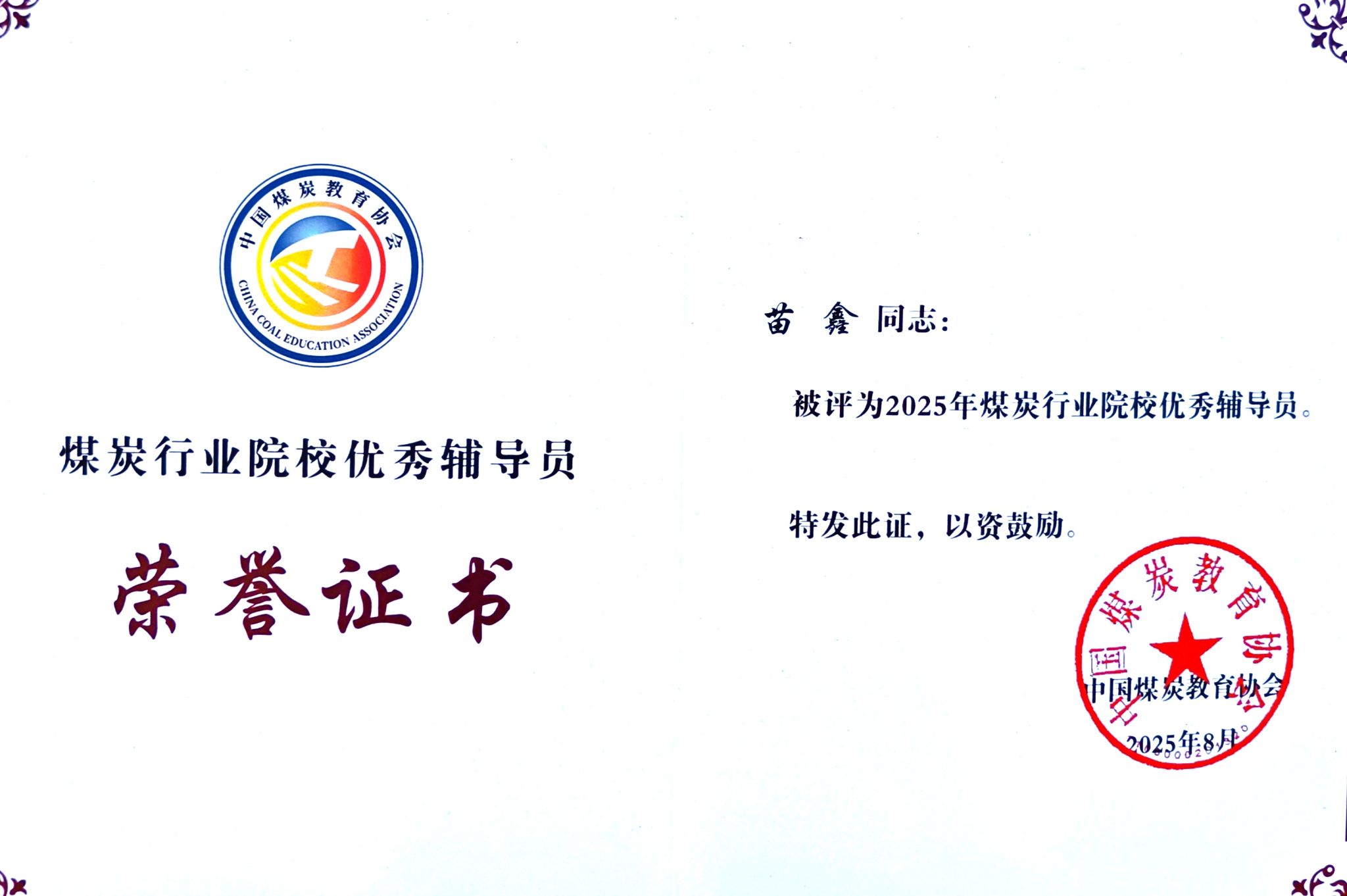 我院辅导员苗鑫获评“2025年煤炭行业院校优秀辅导员”
