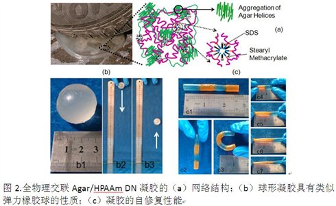 陈强课题组还充分利用了琼脂多糖的热可逆溶胶-凝胶转变的特性,开发了“一锅煮”制备杂化双网络水凝胶的新方法,解决了传统双网络水凝胶制备工艺复杂耗时、成型性差等问题,并且发现该凝胶具有高强度、高韧性和快速的自恢复的性质。在此基础上,发现了琼脂第一重物理网络不同于传统双网络水凝胶的破坏机理,以及调控杂化高强度水凝胶刚性和韧性的新方法。此外,还发现该杂化双网络水凝胶具有良好的抗黏附性质。该课题组2013年以来在该领域共发表SCI论文9篇,其中SCI一区论文6篇,影响因子大于4的6篇(其中大于10的2篇)。