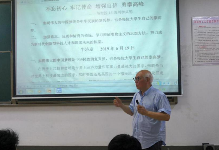 6月19日下午,我校材料学院特聘教授、博士生导师牛济泰院士在我校三号教学楼3211为我院16级材料成型及控制工程专业和材料科学与工程专业金属方向学生作了题为《不忘初心,牢记使命,增强自信,勇攀高峰》的德育宣讲报告,报告会由材料学院16级辅导员崔敏主持,材料学院师生共同聆听了报告会。