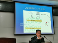 报告会上,阎培渝教授从水泥熟料的形成出发,主要讲授材料具有胶凝性质的条件;硅酸盐水泥熟料的化学与矿物组成;熟料的率值与Bogue计算法;硅酸盐水泥的生产;煅烧与粉磨;水泥熟料化学的发展;硅酸钙矿物的两种水化机理;C3S和C2S的水化;C-S-H凝胶的组成;C-S-H凝胶的结构模型;C-S-H凝胶粒子的形貌;C3S的水化过程等内容。阎教授的讲授深入浅出,将水泥从原料到水泥具有胶凝性的原因分析的清清楚楚,特别结合国际上对水泥水化的最新研究成果把C-S-H的结构模型、水泥水化为什么具有诱导期、加速期为什么会向减速期转变、水泥的水化为什么会终止等理论问题讲解的明明白白。会后,管学茂教授组织了研究生与阎培渝教授的交流。