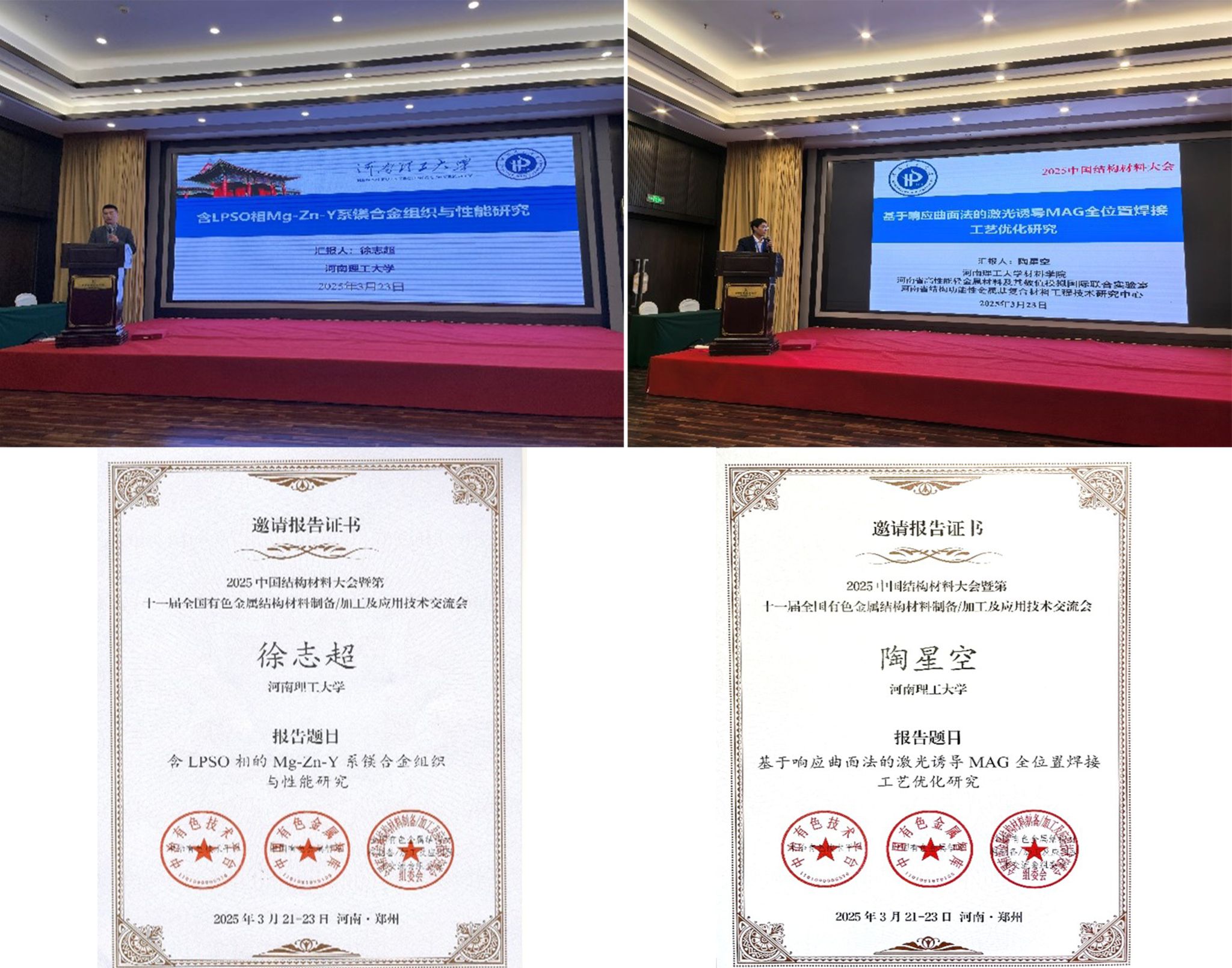 3月21-23日,2025中国结构材料大会暨第十届全国有色金属结构材料制备/加工及应用技术交流会在河南郑州举行, 我院材料加工系教师徐志超和陶星空参加会议并作专题报告。 徐志超在先进金属基复合材料分论坛所作报告题目为《含LPSO相的Mg-Zn-Y系镁合金组织与性能研究》,其分析了现有稀土镁合金的研究现状,从绿色智能化加工的角度阐述了超声辅助变形技术的应用前景,并汇报了团队在该领域研究的最新成果。陶星空所作报告题目为《基于响应曲面法的激光诱导MAG全位置焊接工艺优化研究》,其综述了当前全位置焊接领域的研究现状及技术难点,从焊接热源柔性可调及焊接绿色智能化发展需求角度阐述了低功率激光诱导MAG全位置焊接技术在全位置焊接控形控性方面的优势,最后汇报了团队近期的相关研究成果。 此次会议旨在推动我国结构材料的学术繁荣、技术创新和产业发展,促进结构材料向高性能化、复合化、结构功能一体化发展,加强产、学、研、用深度融合,交流结构材料领域近年来具有创新性的科技及应用成果。我院教师参加此次会议不仅提升了我院在该领域的学术影响力,更为教师们拓宽了研究视野,同时增进了合作交流的机会,为进一步做好相关科学研究奠定了基础。 |