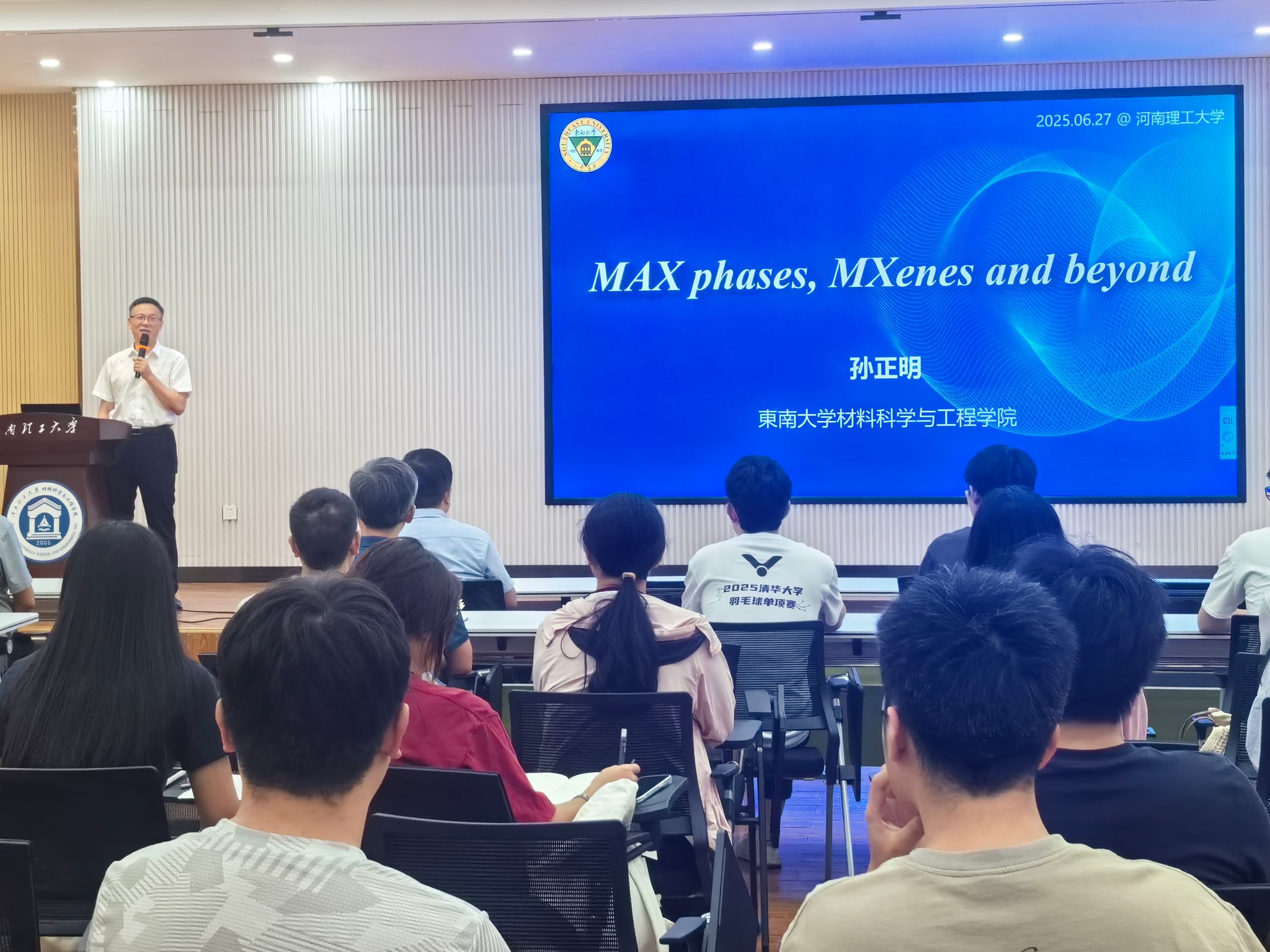 6月27日上午,东南大学孙正明教授莅临我院“求是讲坛”,作题为《MAX Phases, MXenes, and beyond》的学术报告,报告由周爱国教授主持,相关专业教师、研究生参加了报告会。 报告会上,孙正明简要介绍了其研究团队概况。随后,他围绕MAX相材料中的金属晶须自发现象,系统阐述了团队在晶须生长机理探究及抑制策略方面的研究成果。紧接着,孙正明重点介绍了MXene材料在电化学储能领域的应用进展。报告内容丰富翔实,讲解深入浅出、生动形象,极大地激发了在座师生对MAX/MXene等新型层状材料及其前沿应用的浓厚兴趣。在互动交流环节,孙正明与现场师生进行了充分交流,耐心细致地解答了大家提出的问题,令参会师生收获颇丰。 孙正明,“国家特聘专家”、东南大学首席教授。近年来,在金属性陶瓷MAX相材料、二维材料MXene等在能源环境领域的基础与应用研究中取得重要进展,得到国家重点研发、国家自然科学基金重点及面上、江苏省双创团队等重大科研项目支持。在Nat Commun、Angew Chem Int Ed、Adv Mater、Adv Energy Mater、Energy Environ Sci、Acta Mater等期刊发表学术论文300余篇,授权发明专利40余项。任中国材料研究学会理事,中国复合材料学会常务理事,江苏省材料学会副会长等职。 |