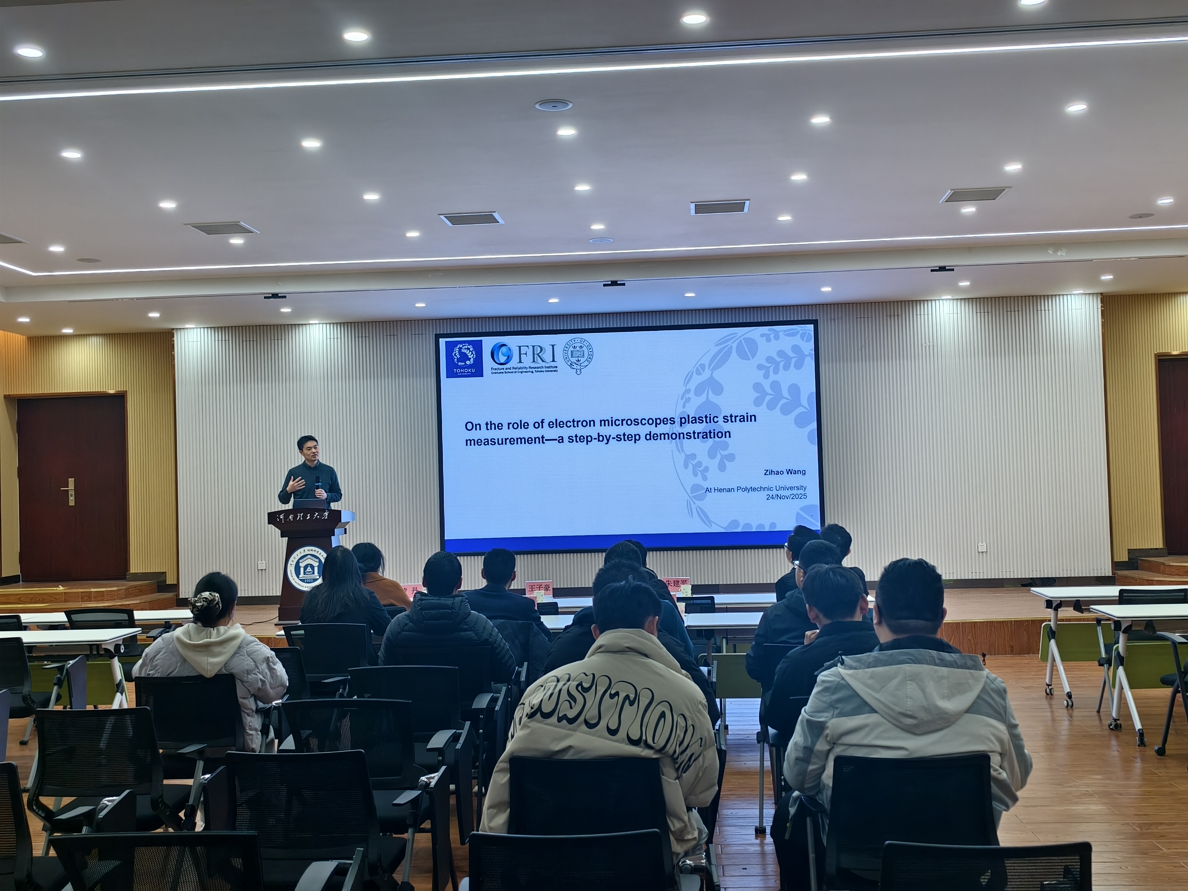 11月14日下午,日本东北大学王子豪副教授受邀来邀莅临材料学院,在材料学院院楼2103会议室作题为《基于电子显微技术的金属材料多尺度应变表征研究》的学术报告和交流活动。报告由黄丹院长主持,相关专业的教师和研究生参加了报告会。