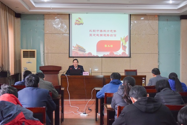 11月20日下午,应学院邀请,学校关工委德育宣讲专家张玉培老师在院1203学术报告厅,作了题为《比较中美两国态势,坚定我国道路自信》的专题讲座,全院教师参加了报告会。报告会由院党委书记欧阳文峰主持。
