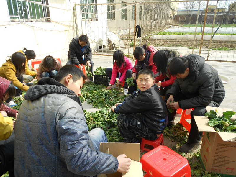 福康学校是一所福利学校,在这里学习的都是智障人员,他们需要大家的关爱。在校领导的安排下,志愿者们分成两组开展劳动,第一组基本上是女生,她们负责将学校菜园里的菠菜拔下来并清洗干净。很快,她们便清洗出几袋菠菜。