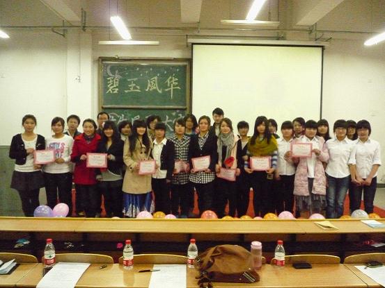 正值碧玉风华,炫目青春舞台。为了给女生营造轻松温馨的大学生活环境,展现女大学生青春靓丽,激情飞扬的精神面貌,彰显我院女生风采,展现当代女大学生的个性魅力,我院学生会女生部特于3月10日在院楼1203室举办了女生节“魅力天使”系列活动之“碧玉风华”女生风采大赛决赛。本次比赛共有11个小组参赛,其评委有我院学生会常务副主席高颖霄、副主席季浩等。