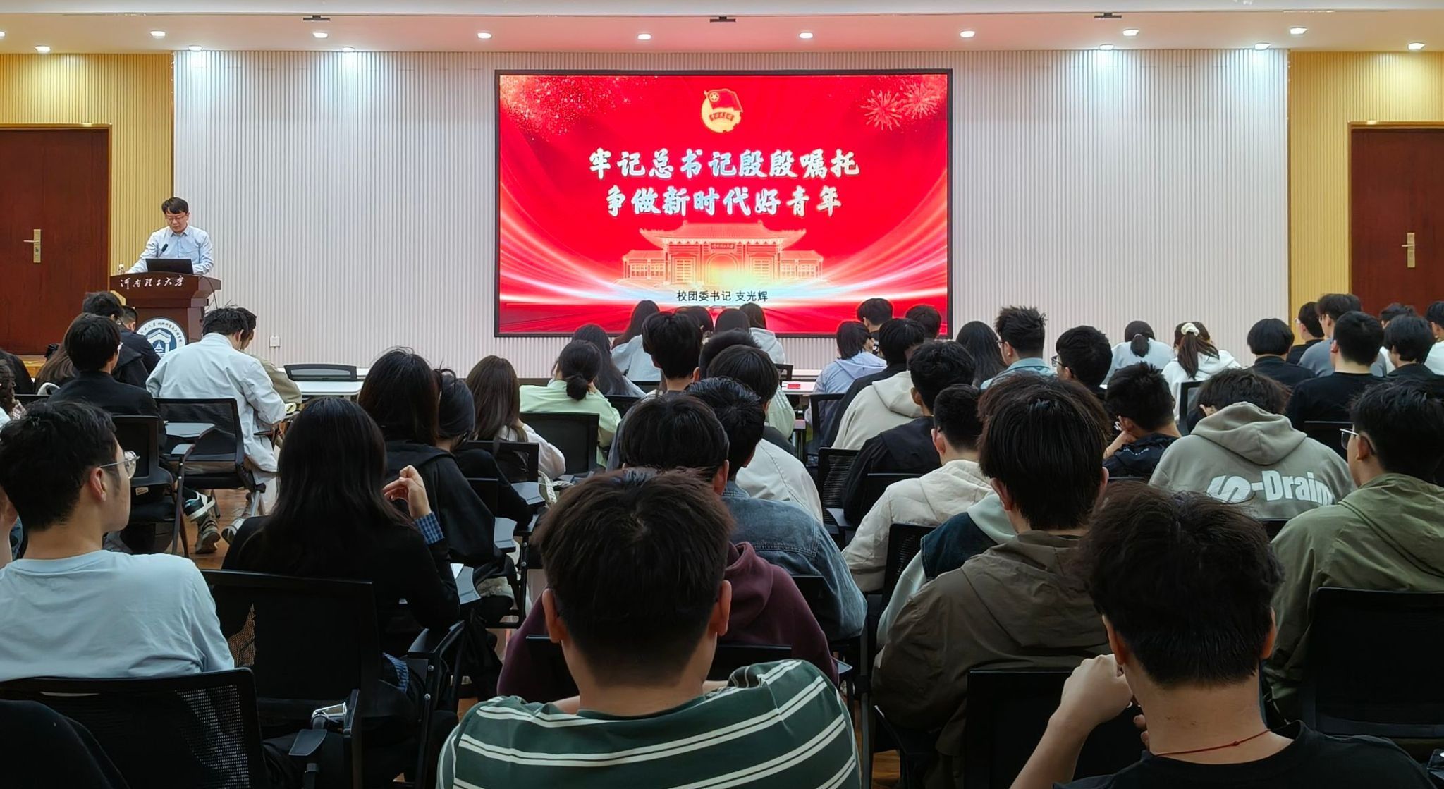 支光辉以《牢记总书记殷殷嘱托,争做新时代好青年》为题,从四个维度深入阐释新时代好青年的内涵与担当。在追梦者维度,支光辉列举全红婵兼顾学业与高强度训练的卓越表现以及我校众多优秀学子的突出事迹,鼓励同学们勇敢逐梦,在各自领域发光发热。谈及担当者,他列举黄文秀等人的拼搏事迹来诠释新时代青年的使命担当,同时还特别提及我校毕业生吴海燕及研究生支教团事迹,激励学生勇担时代重任。在激励学生成为奋斗者时,支光辉指出我校2024届多个班级考研成绩优异,背后彰显出我校学子坚韧不拔的毅力和积极向上的精神,为大家树立了奋斗标杆。在开拓者维度,他通过介绍深度求索公司突破AI模型极限的C919研发团队青年工程师来勉励学生们做新时代的开拓者。