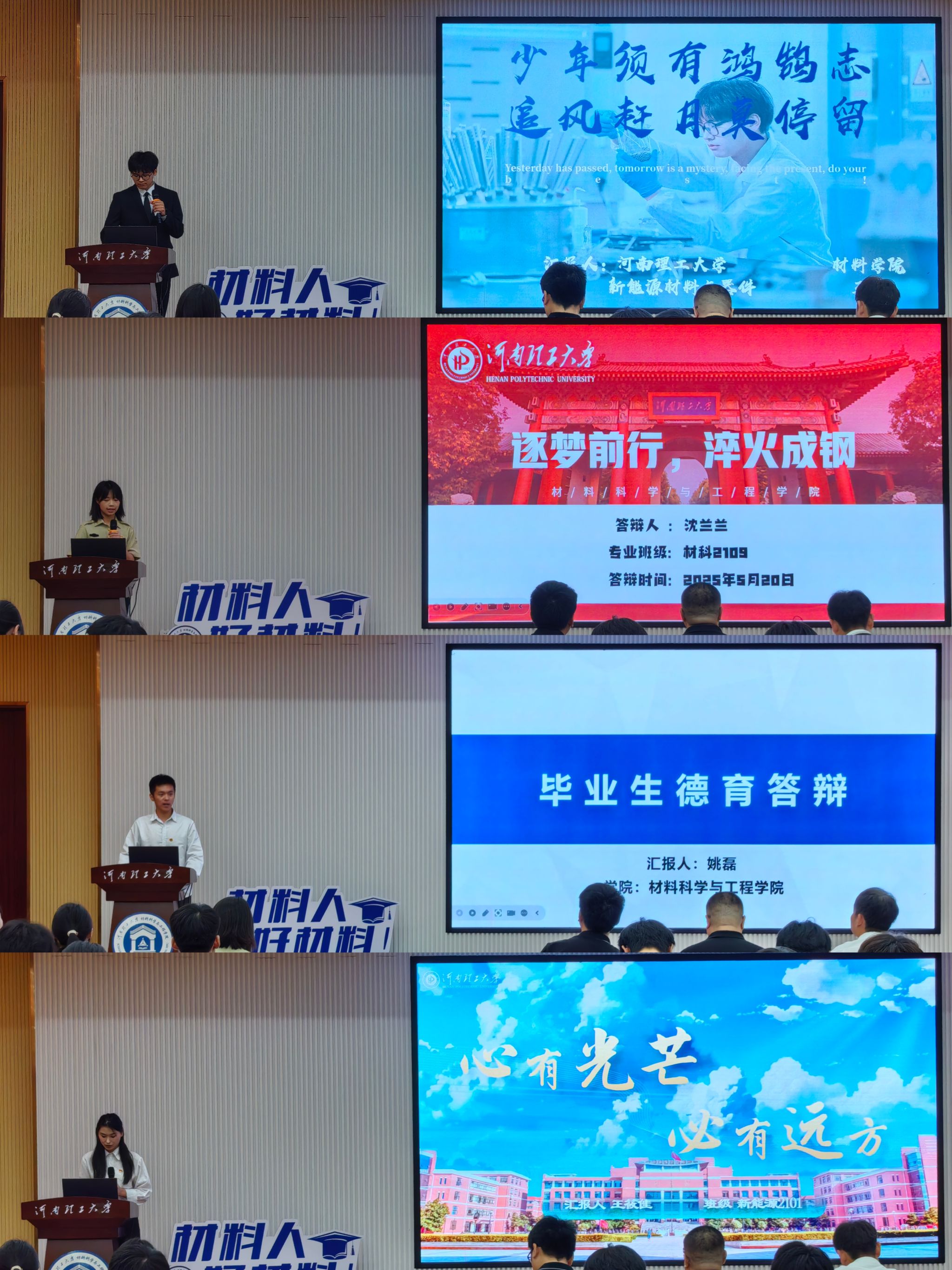 德育答辩是掌握学生成长轨迹、强化思政教育引导、推动学生自我提升完善的有效举措。材料学院自2007年起开始在本科毕业生中实施德育答辩,到今年已经连续开展19年,成为学院一项重要学生工作品牌。今后,材料学院将继续坚持“五育并举”,把德育贯穿人才培养全过程,把好人才培养“出口关”,努力把学生培养为“有理想、敢担当、能吃苦、肯奋斗”的新时代好青年。