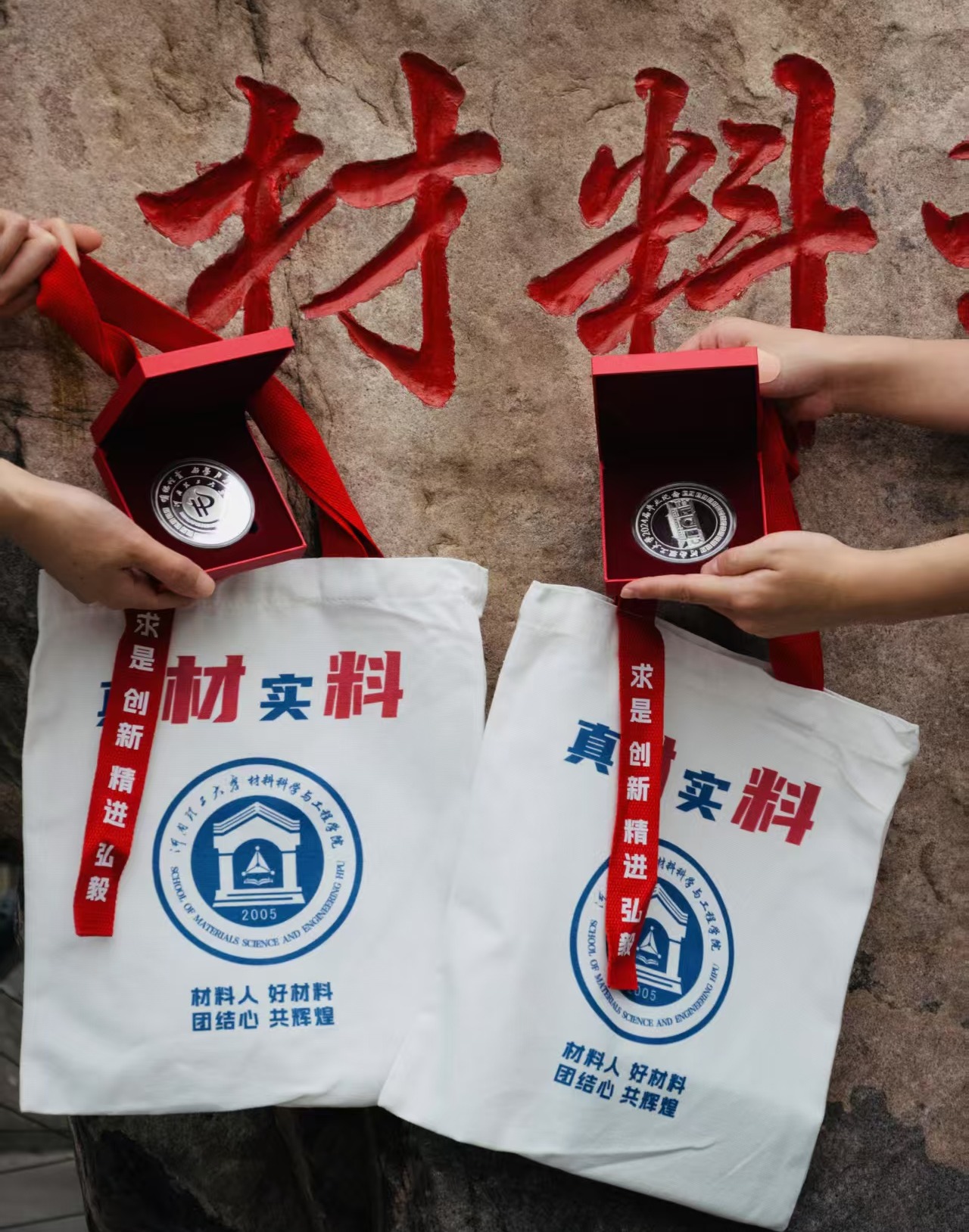 一枚刻有“材料人·好材料·团结心·共辉煌”及毕业生姓名的专属纪念印章,寓意每位学子在母校留下的不可磨灭的个人印记,希望同学们常怀感恩,不忘初心,砥砺前行。一个印有院风“求是、创新、精进、弘毅”和院训“真材实料”的帆布手提包,希望同学们背上“行囊”轻装启程,在新的征途中,满怀理想信念,努力拼搏奋斗。同学们动情地说,“拿到刻着自己名字的印章那一刻,真的特别感动,这枚印章很小,但分量很重,它是母校和学院给我的最后一份‘学籍证明’,也是我开启人生新阶段的‘签名章’。”